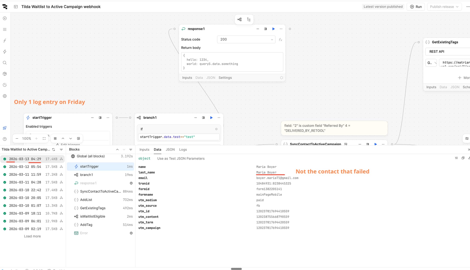 - Issue: I have a web page hosted on Tess. On this web page, I have a form submission to which Tess delivers to my Retool webhook. In most cases, it delivered correctly, but this Friday I got a notification from Tess that delivery failed. At the same time, in Retool I don't see this delivery attempt at all.