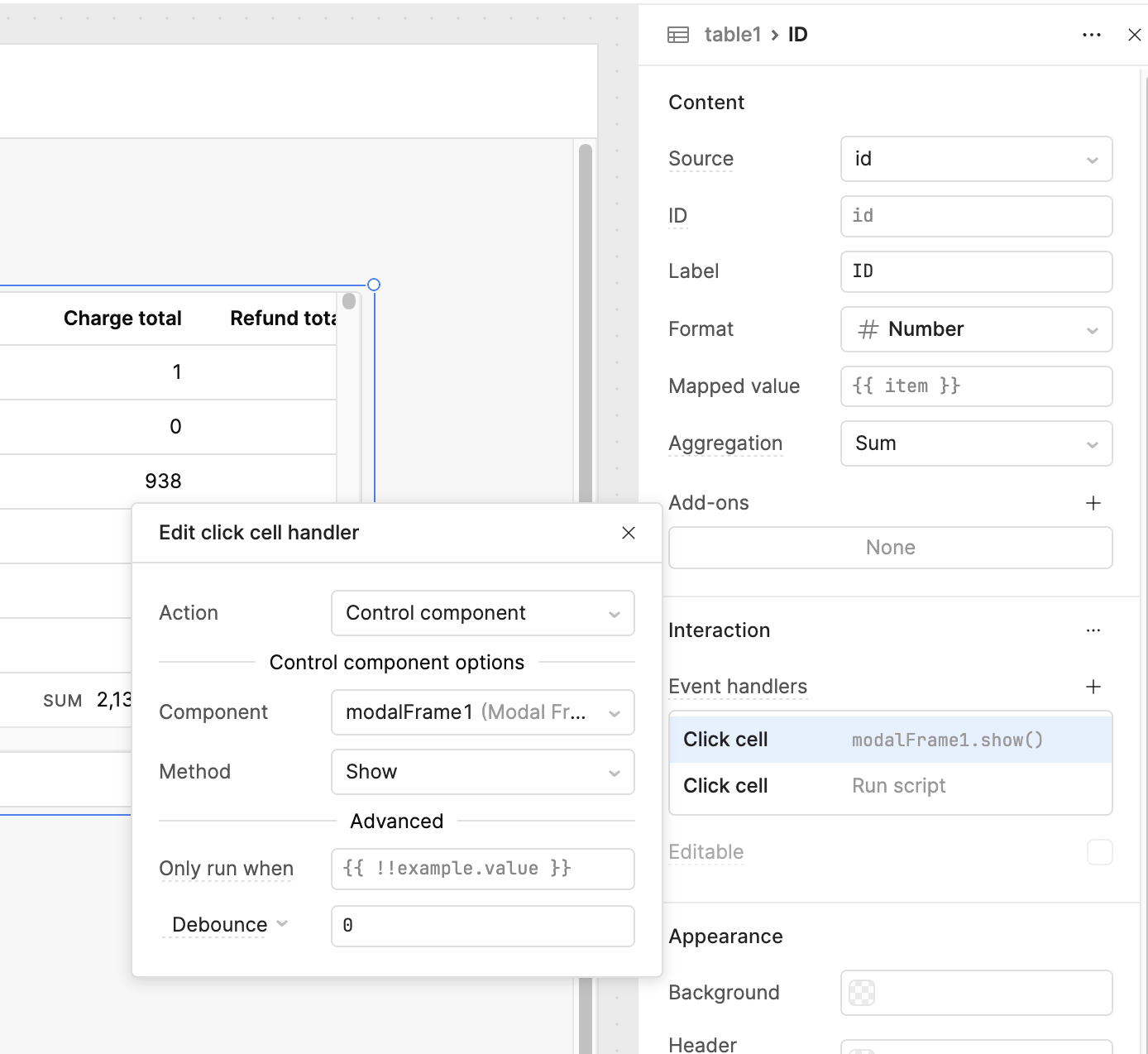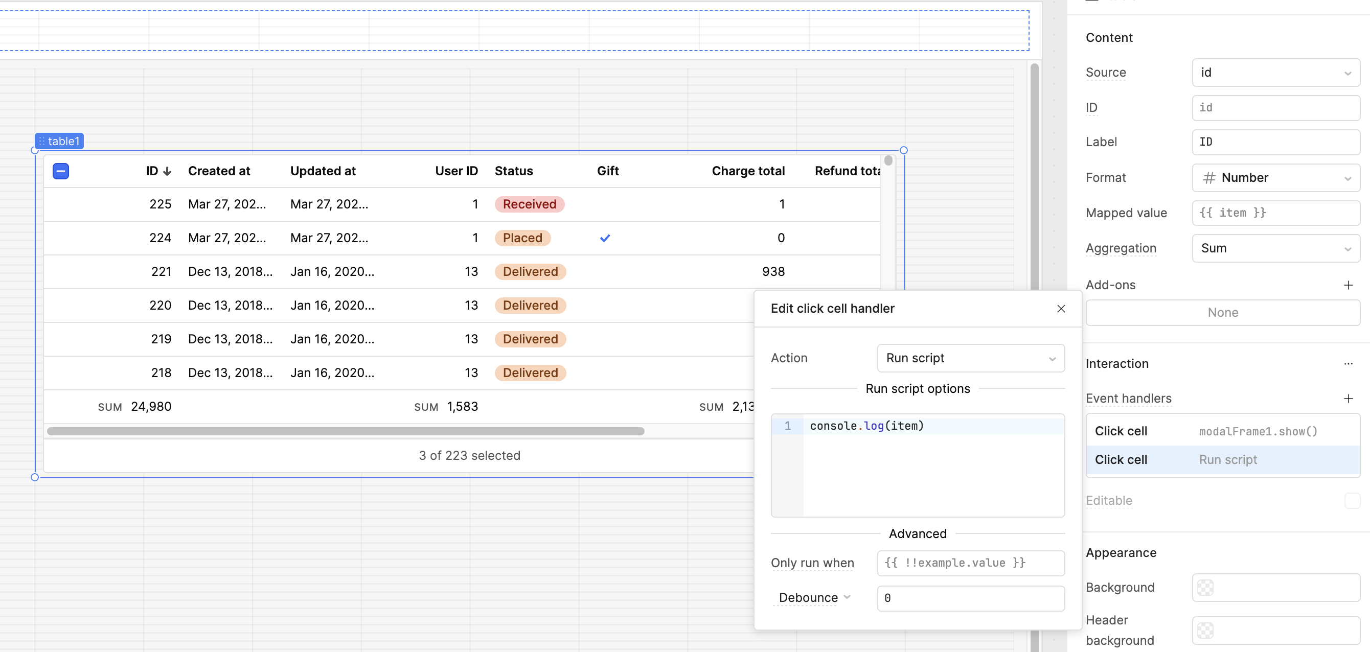 To access the data that is in the cell when it is clicked, this data will be available in a script as item and can be used to set a variable's value to be accessed in the component.