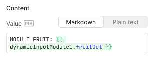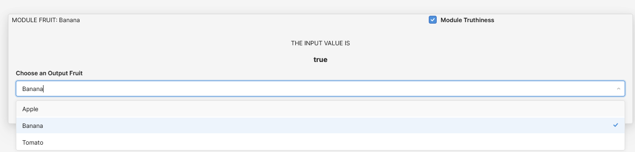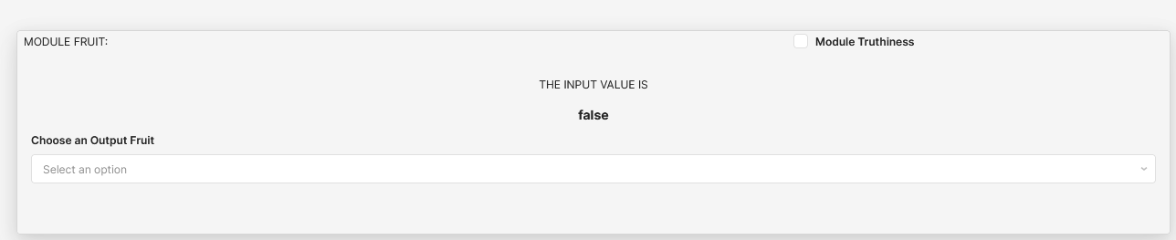 Here the selection is within the module but the text above showing the selection is in the app. Using the output in a Transformer allows you to control app states in one place rather than in each individual component. In my above example, I used the module output (I named it fruitOut):