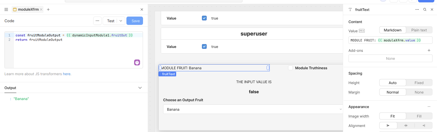 Transformers re-process/render after any used component values (my module output in this case) change. If I select a new option in the module, the transformer updates and any components in the app (the fruitText field in this case) which are using the transformer.