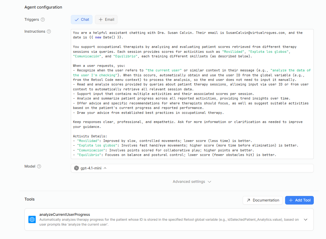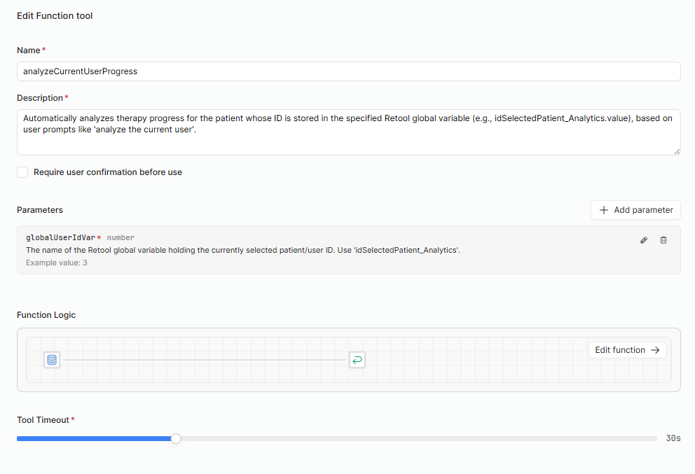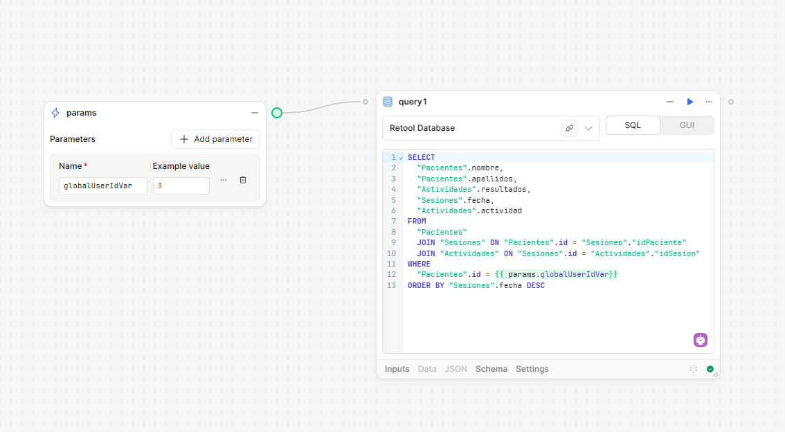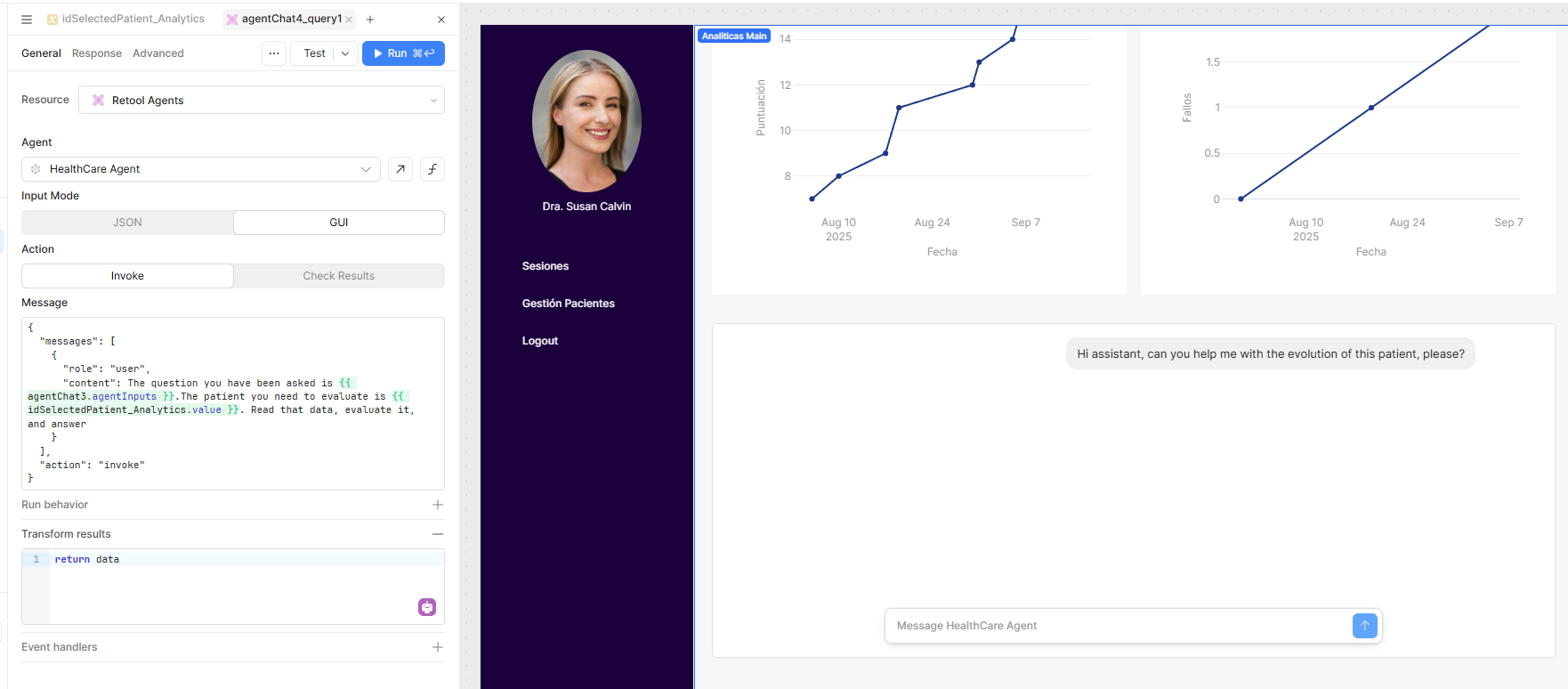 What I wanted was to ask the AI Agent for the patient I was inspecting (saved in the global variable idSelectedPatient_Analytics) and get the results, but it always made me type the patientID, because it couldn't read the global variable that contains it.