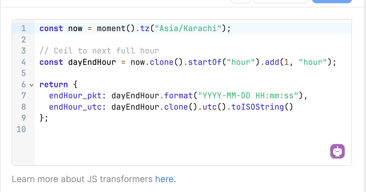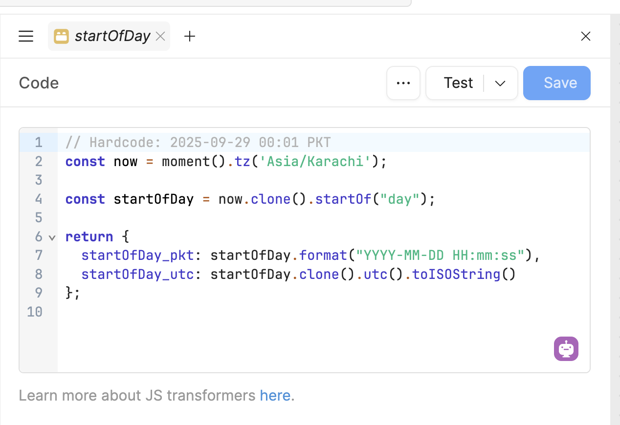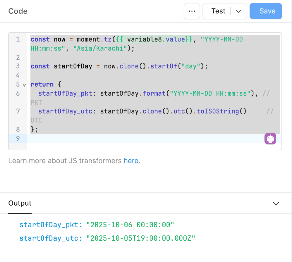 After this, your transformer code will work correctly. For example, you can use the live-updating variable to calculate the start of the day like this: