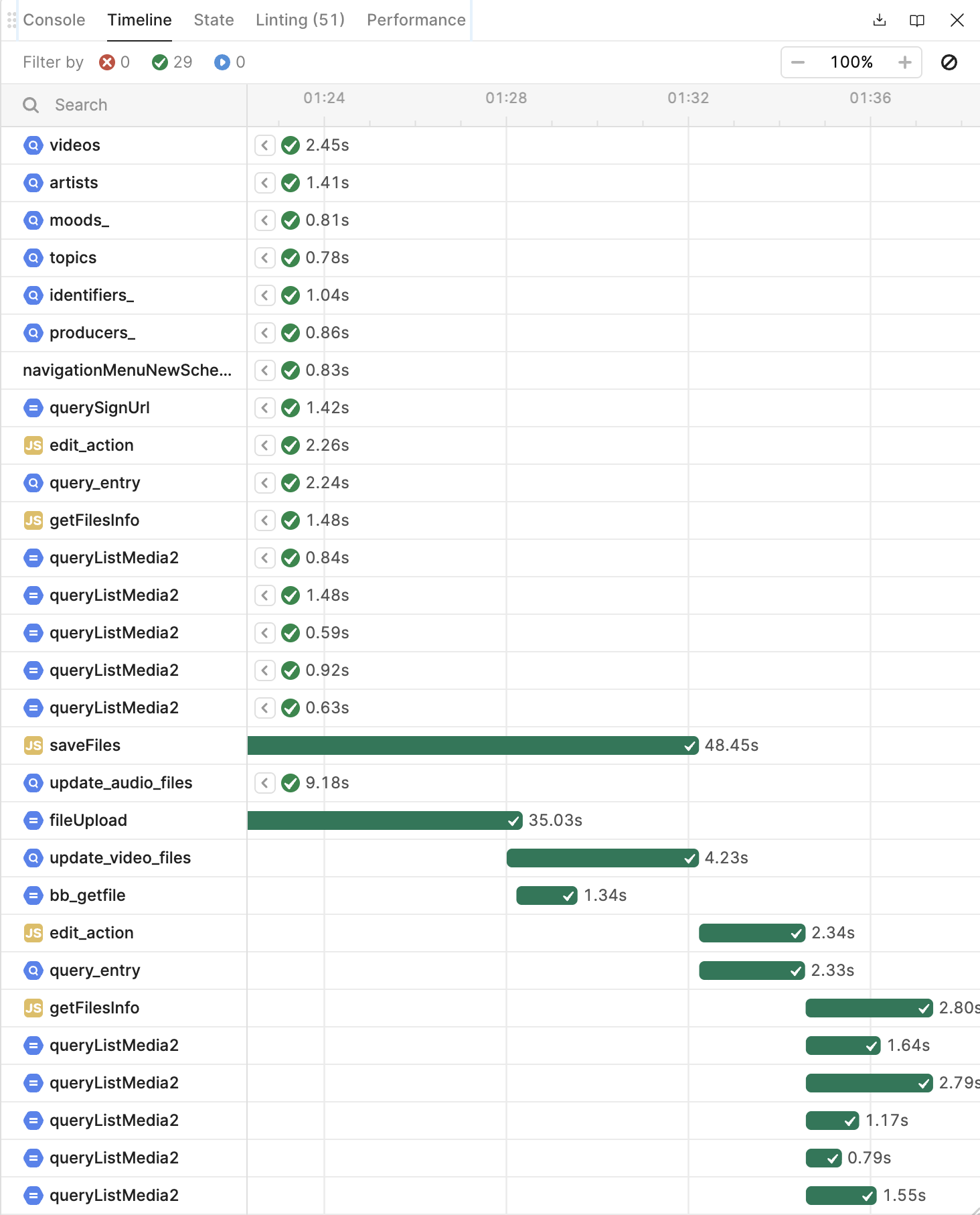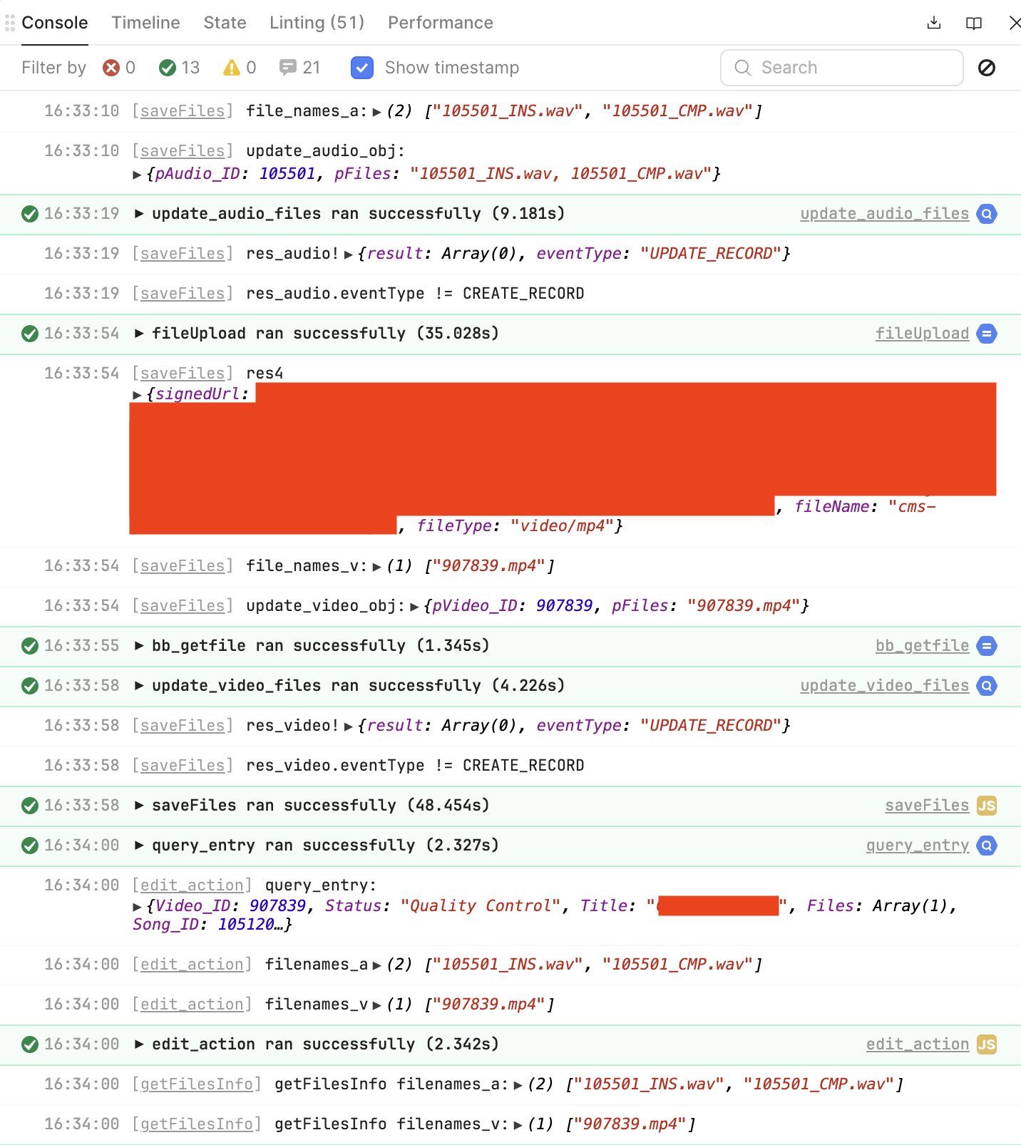 In the timeline, you'll see that saveFiles is the script that is driving 'fileUpload' and that seems never to complete. I know it says 233 seconds here (we're uploading an MP4 to GCS) but this continues indefinitely every time I've tried.