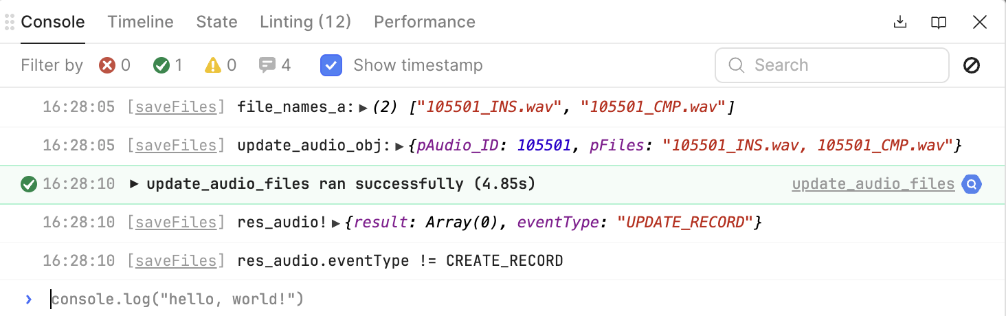 You'll notice that it doesn't show that a response is returned in retools debug console, but in Chromes console I actually do see it's finished uploading, how we would expect: