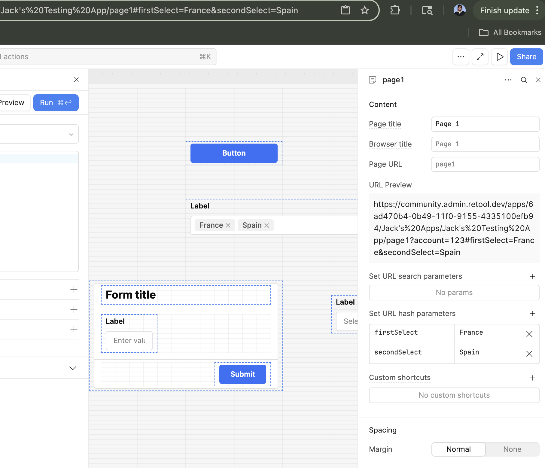 Just about any user event such as a button click with the Action set to "Go to Page" should allow for configuration of query params, hash params or other variables that you can pass between pages of an app. As shown in the bottom image of our docs here. Which should be able to pass directly into the multiselect to have these become selected once they render. Maybe there are race conditions and the multiselect still needs to load to the page before the selection can be applied