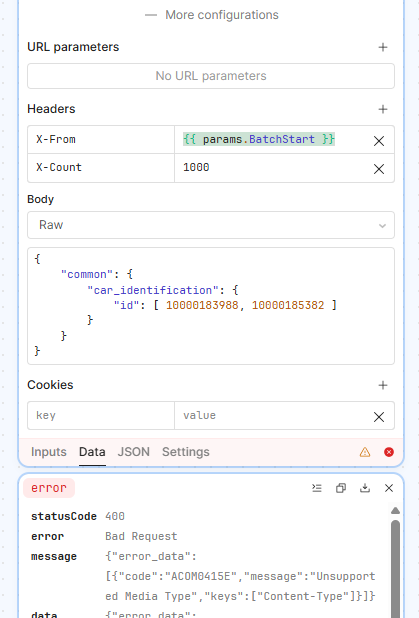 I am trying to make an API request with a JSON body, where I pass in the contents of an array as a string. I have set the API body as raw. This works fine in Postman, but fails in Retool.