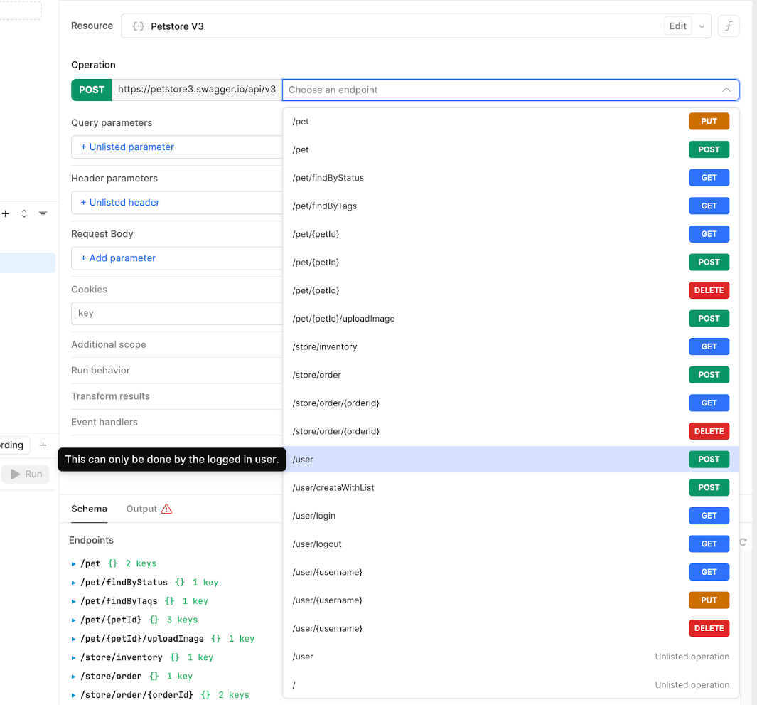 - Type any endpoint path to use an "unlisted operation" not in the spec