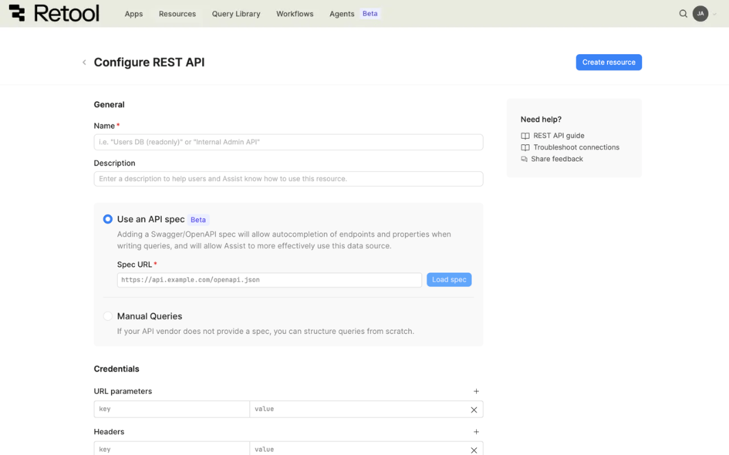 REST API resources now have a new “Use an API spec” mode (beta). Add an OpenAPI/Swagger spec URL and the query editor becomes spec-aware—so you spend less time context-switching between docs and Retool, and more time building.