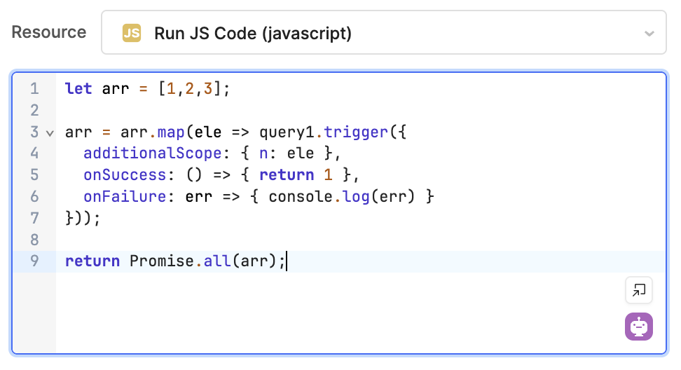 Then you can pass the data you want to another loop block to make the second set of API calls. The handling of undefined in queries in the app can be somewhat limited when making large batches of calls and is better suited for making single calls instead of using JS and Promise.all to run concurrent async queries/API requests.