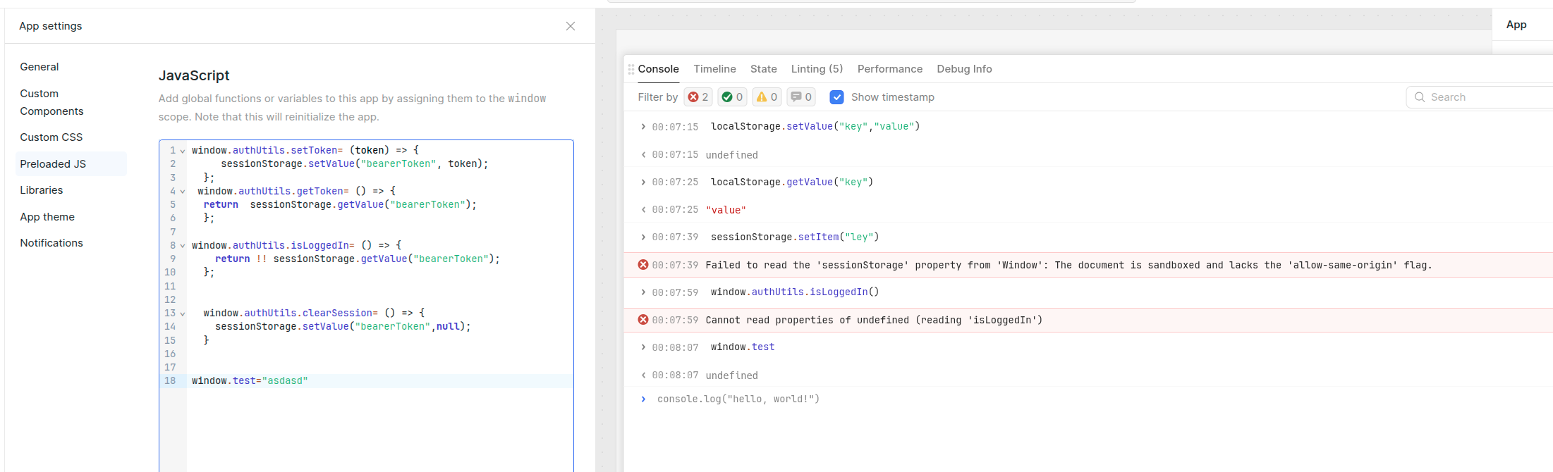 Retool apps run inside a sandboxed iframe, so browser APIs like window.sessionStorage and the native window.localStorage are blocked. You can’t rely on browser storage in the usual way inside a Retool app.