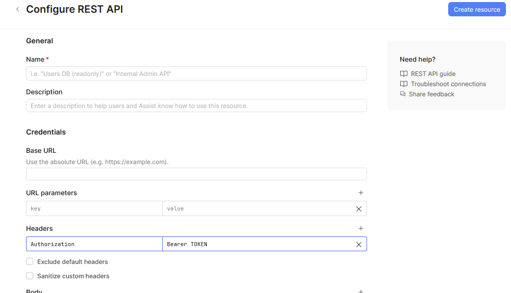 If you are using a bearer token, you’d want to store it at the resource level which will then apply your authorization headers when you use the resource in an app/workflow.