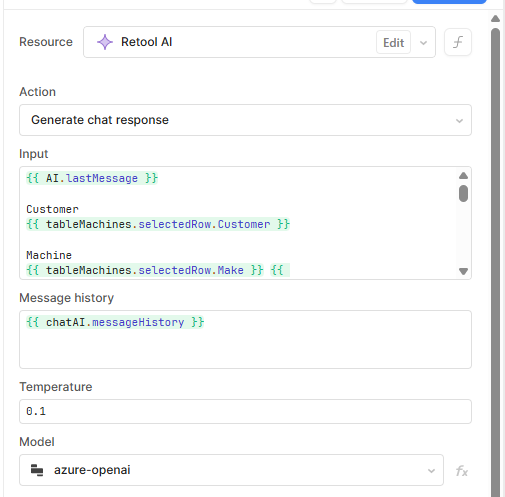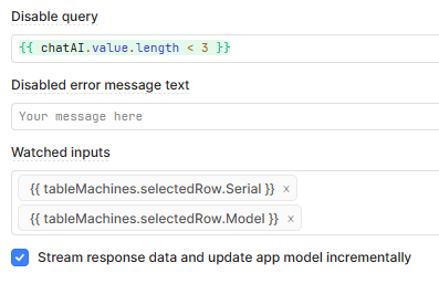 I have a main table, that based on row selection polulates a tab container. One of the tabs has an AI chat component (called chatAI). When a ask a question, I corrrectly get a response, but when I click on the table to populate with new data, the chat history remains.