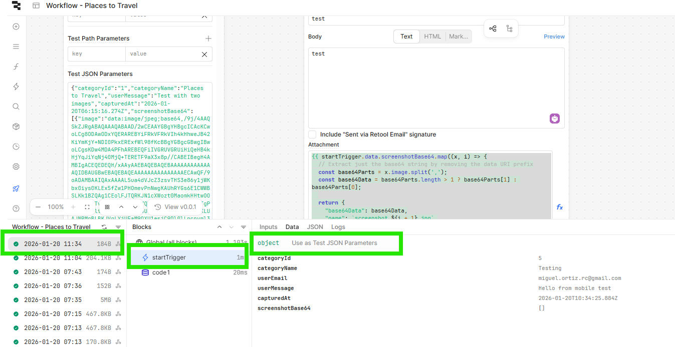 About attaching images to an email, are you using Retool's email? If so, you can add the following to the attachment section (remember to click on the FX button so you add the below code):