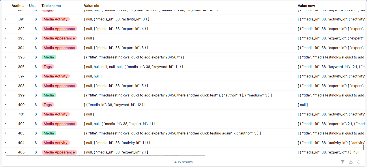 {audit_id: Array(405), user: Array(405), table_name: Array(405), value_old: Array(405), value_new: Array(405)β¦}