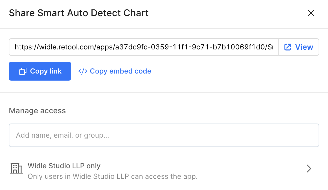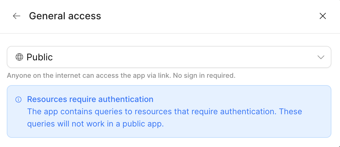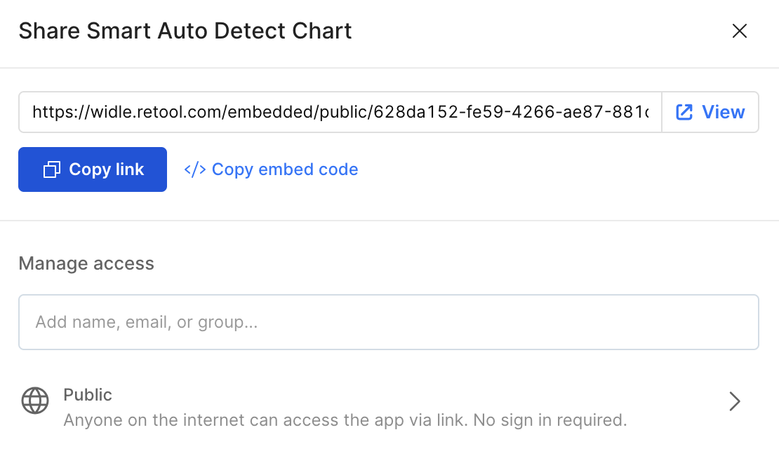 - Select “Public” to allow access without requiring users to log in to Retool. The shareable link will update accordingly.