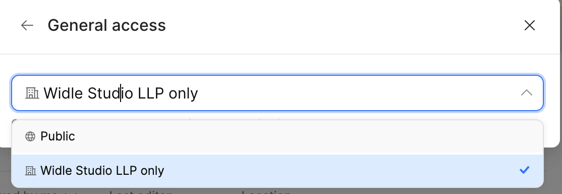 - A dialog box will appear with a generated share link. By default, access is restricted to your organization.