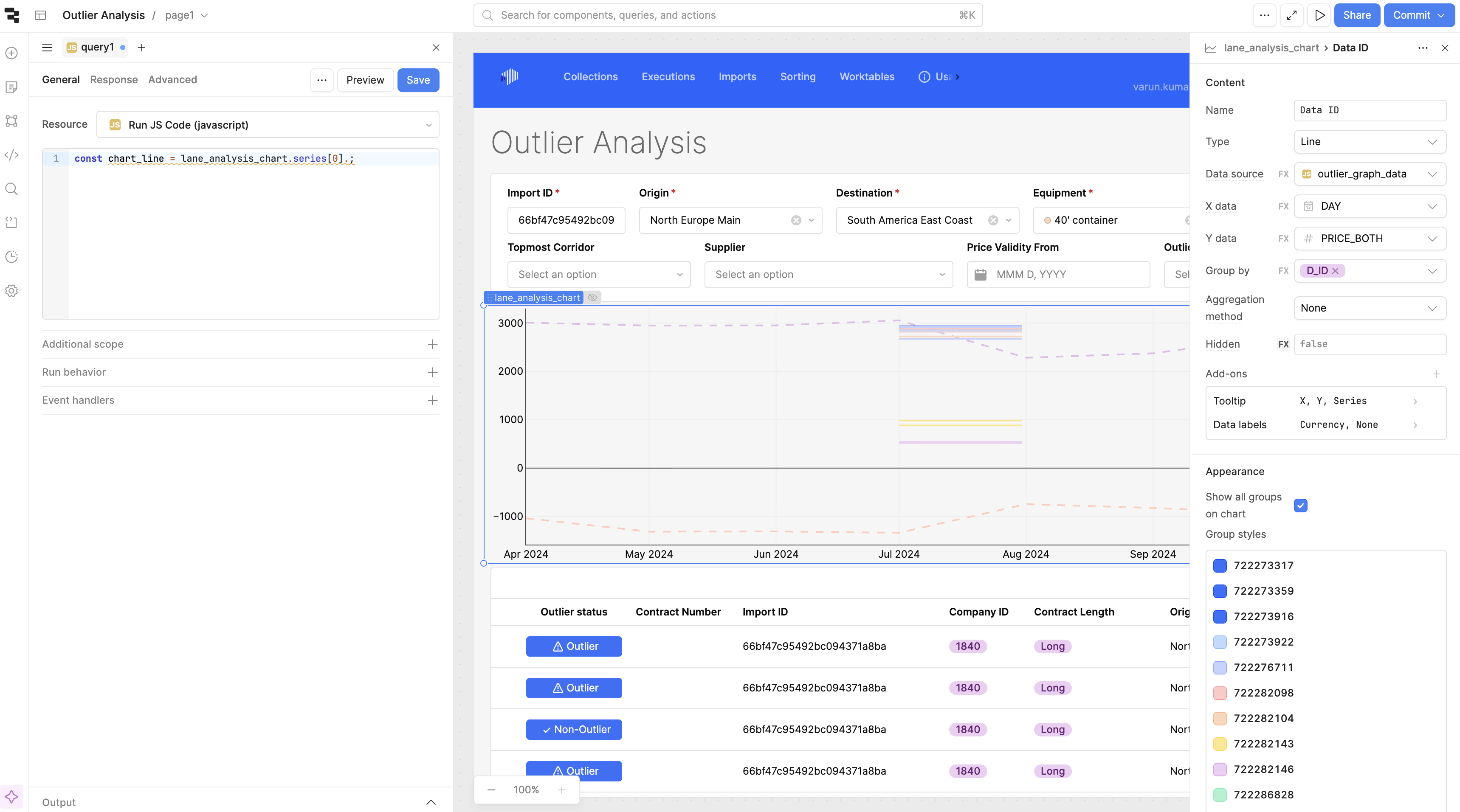 - The new Retool Line Chart auto-assigns colors when grouping and does not currently support forcing a single color.