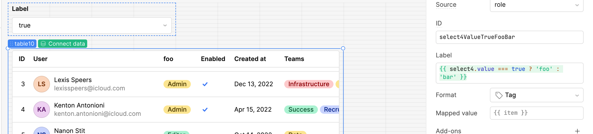 select4with boolean options (true/false). - A Table component where the column label is dynamically bound using the above expression.