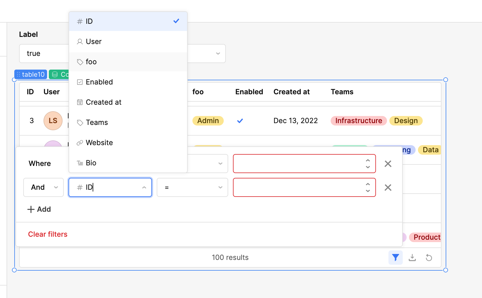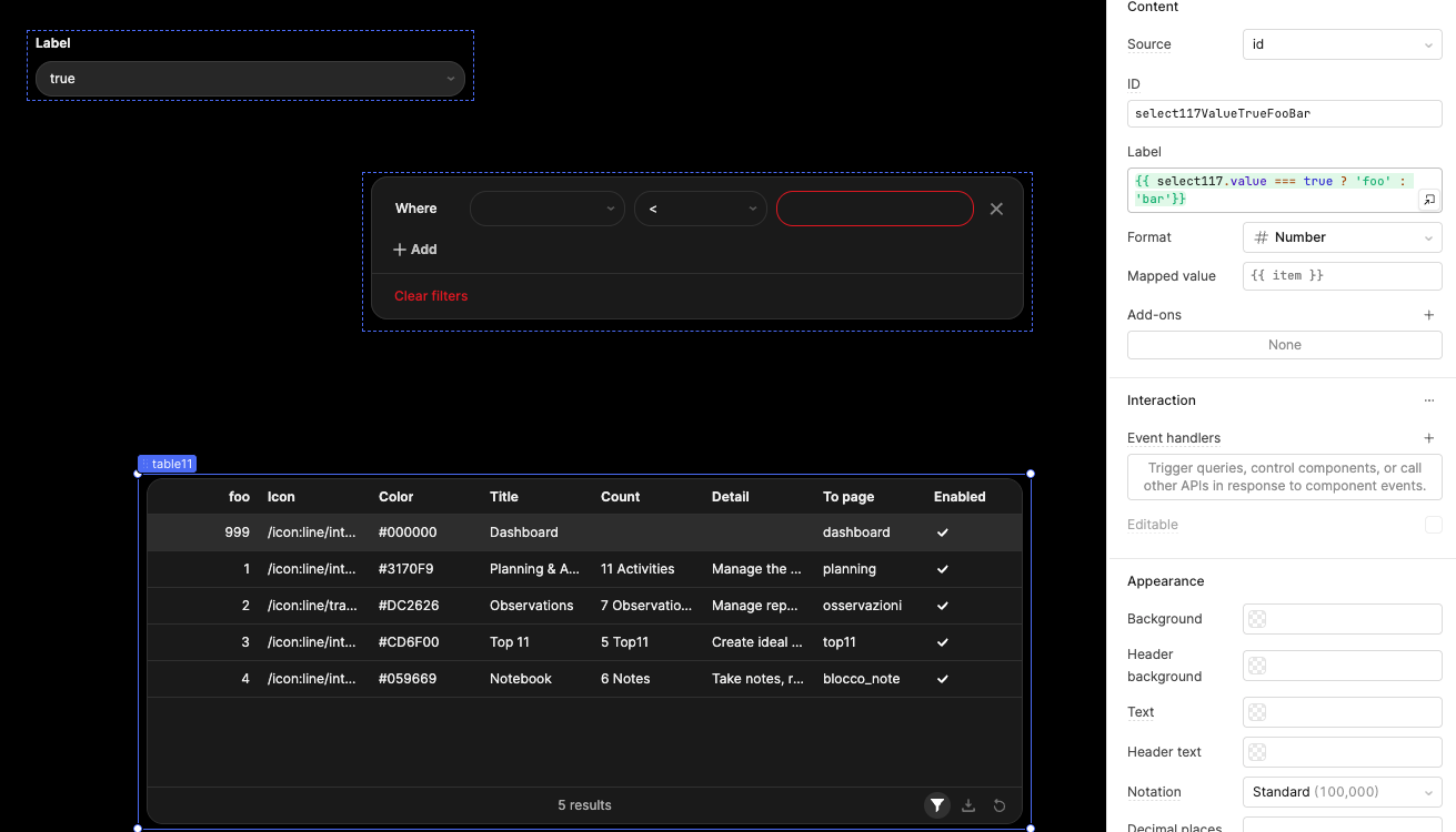 Hello, i’m building a table that use the Filter Component to perform advanced filtering. The filter component is linked with a table that contains some columns with dynamic labels, such as: {{condition ? “foo“ : “bar”}}