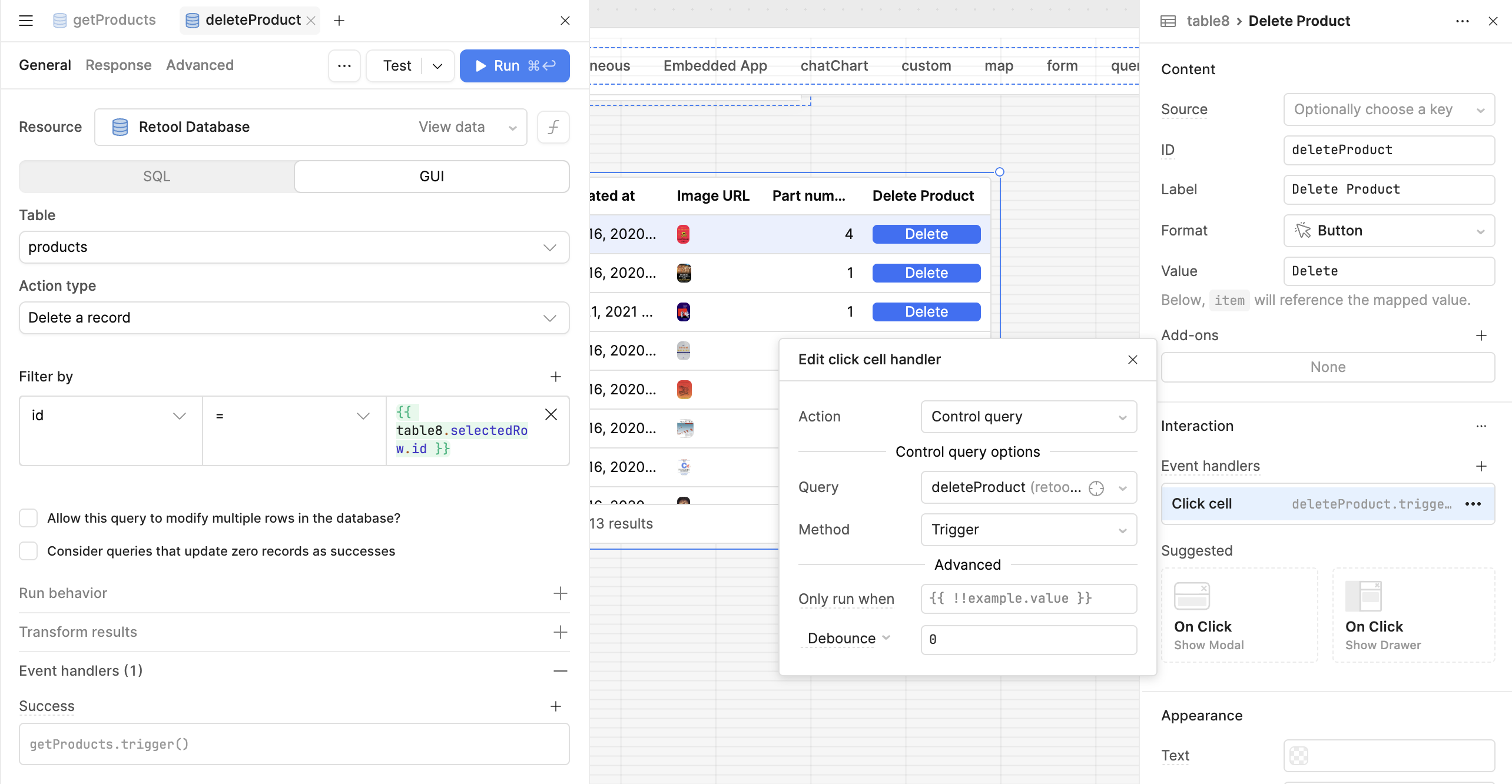 The delete query should look for {{ table1.selectedRow.id }} instead. Below is an example of how this might look: