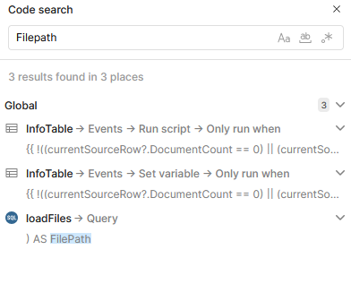 When I go into FileListModule and I use the Code Search (and I search for FilePath), I get three results. One isn’t really related, and the two other results match what I see in the error (InfoTable → Events → Run script → Only run when).