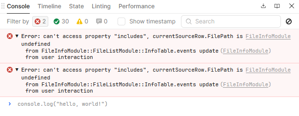 When I have this empty value, FileInfoModule throws an error (it throws it twice as the issue is apprently there twice):Error: can’t access property “includes”, currentSourceRow.FilePath is undefined