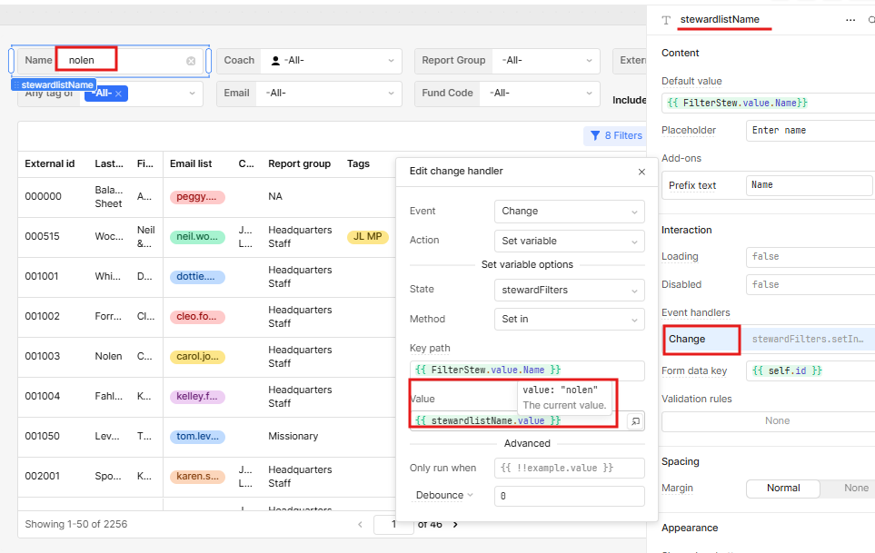 - Steps I've taken to troubleshoot: I verified every setting for the filter fields and the tableās default filter definitions, the global json object that holds the current setting of the filter fields. I tried recreating it, moving it, etc. I hover over my Change event attached to a filter field (In the case below, Name) and see its value it never gets assigned. Iām using āIn Posā to set the value of the item in the json variable. it does not update. I canāt find documentation about how it ought to be set. my formās default filters reference the items in that global json variable.