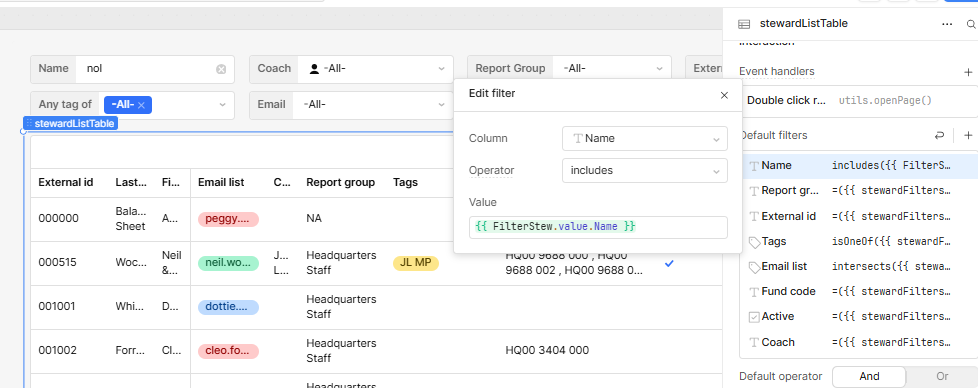 - My goal: Get my filters to (1) set, and (2) stick when I move to another form and them move back. I just want to update the items in a global json variable and use them to drive the table filtering.