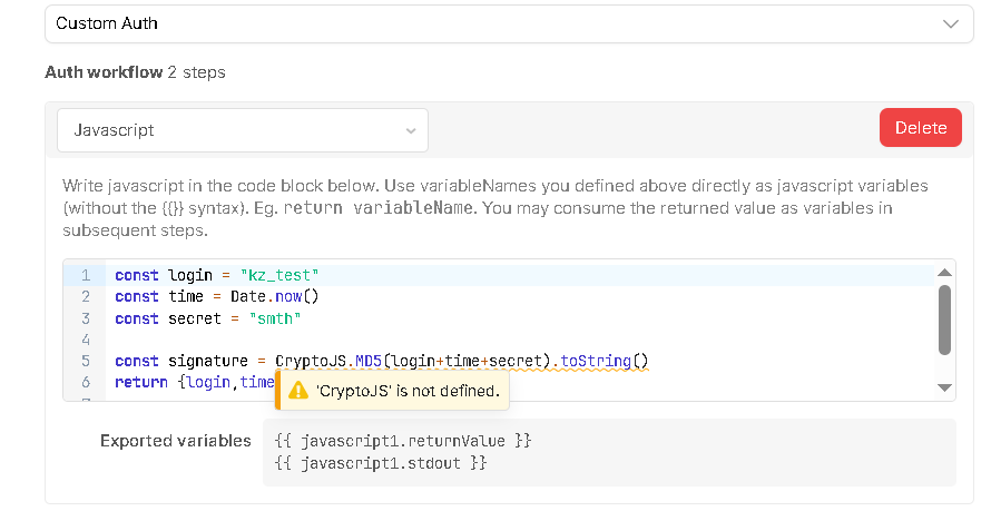 I added a library (https://cdnjs.cloudflare.com/ajax/libs/crypto-js/4.0.0/crypto-js.min.js) to my organisation and now I can call its functions from any apps, but not from API custom auth Javascript. What's wrong?