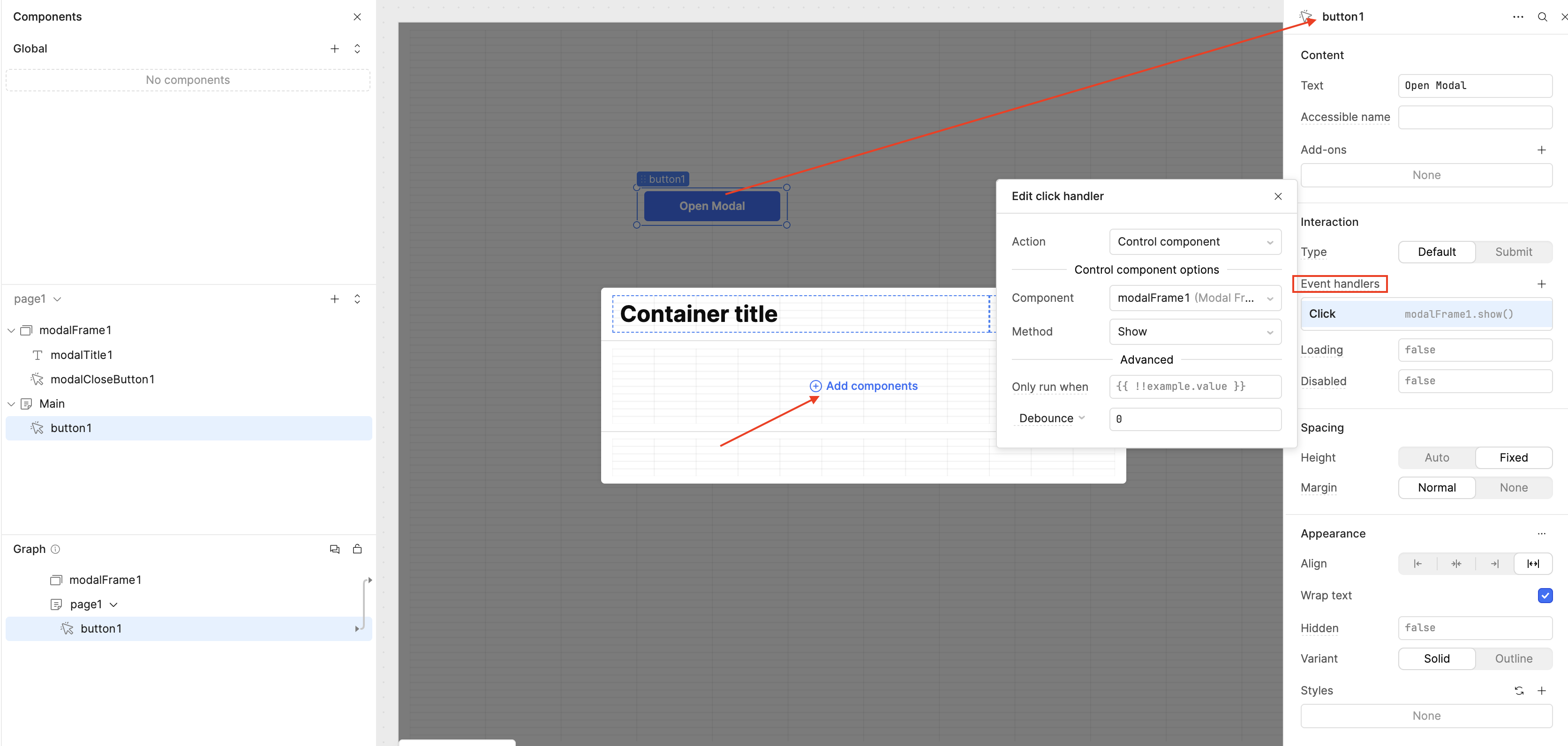 OK you don't need an event handler because the modal will open when you click the Open Modal button.