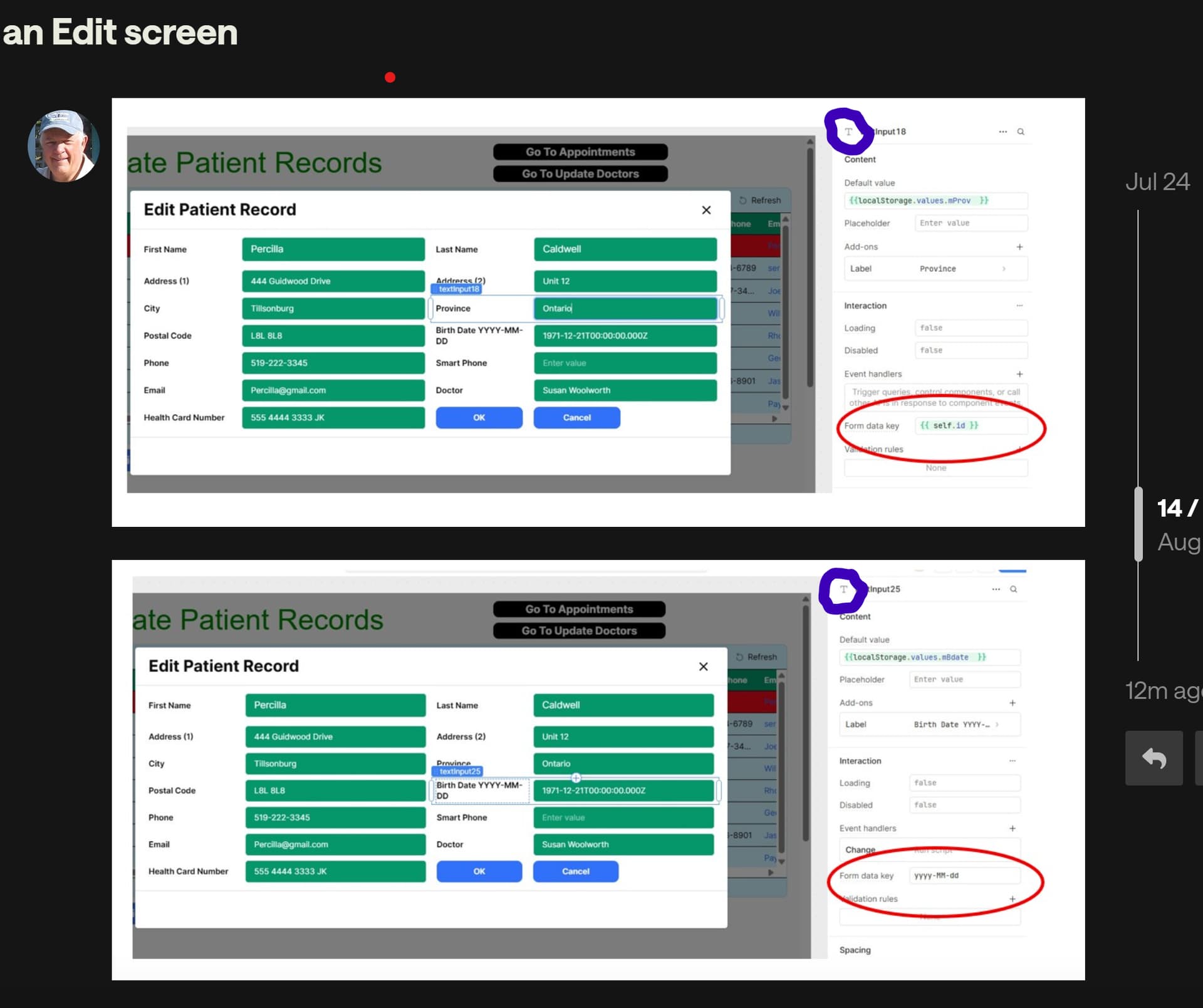 1- I see the "Form data key" field is empty in your textInput20 component. I'm assuming then that this field is being populated via the "Default value" options, right? Are you able to share what you have in that field?