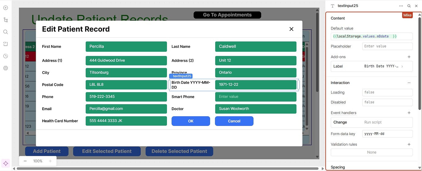 I have a second screen called "Edit Patient" that takes the current values in the table and puts them into localStorage. Then these values are put into the "Edit Patient" Screen. Most values are text and they come up perfectly. Its just the date value that comes up as a Time Stamp.