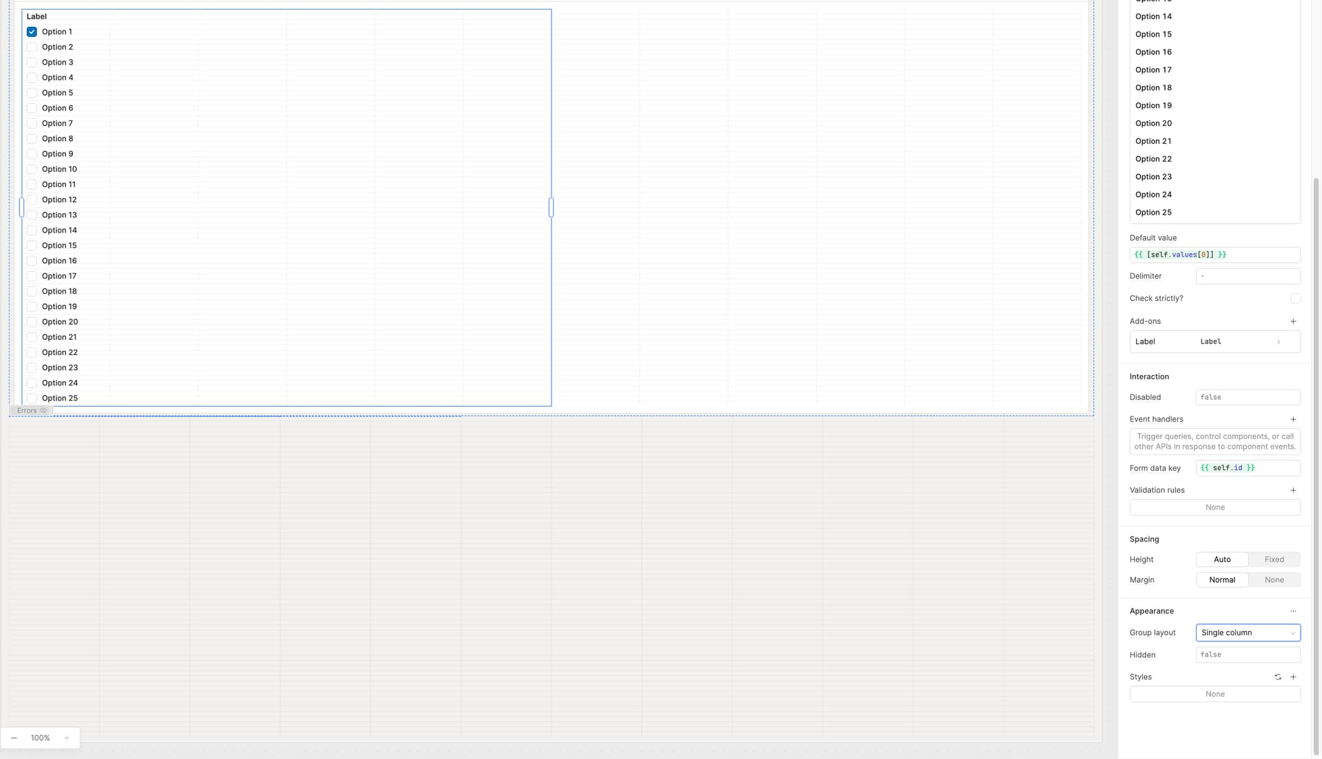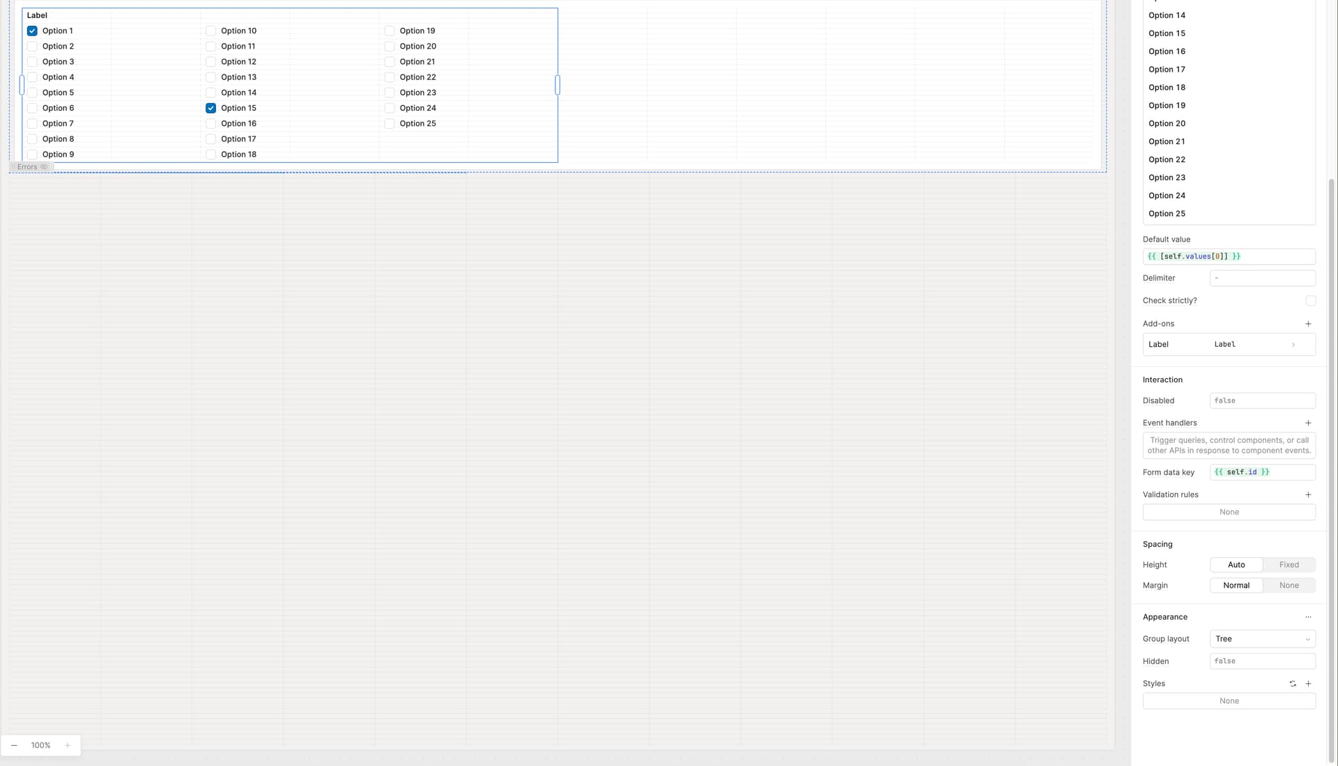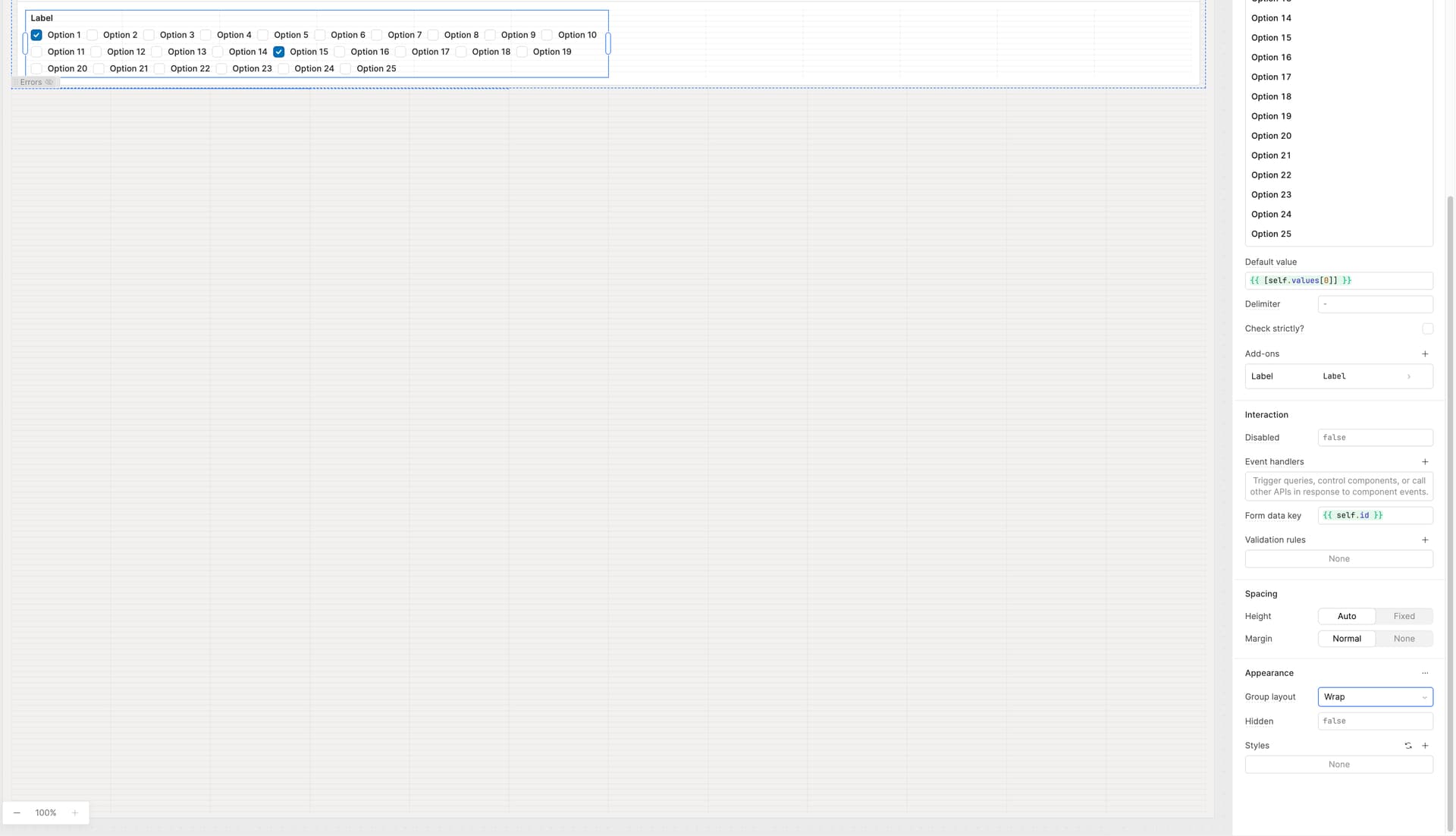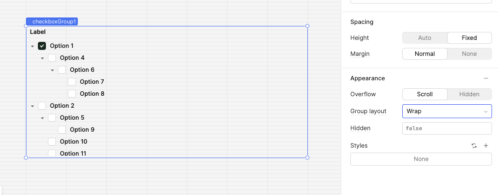 Be able to try auto column, wrap, or tree layouts on a CheckboxGroup component.