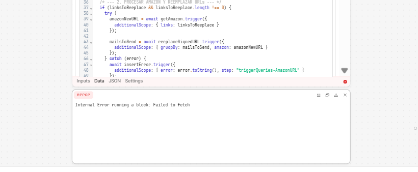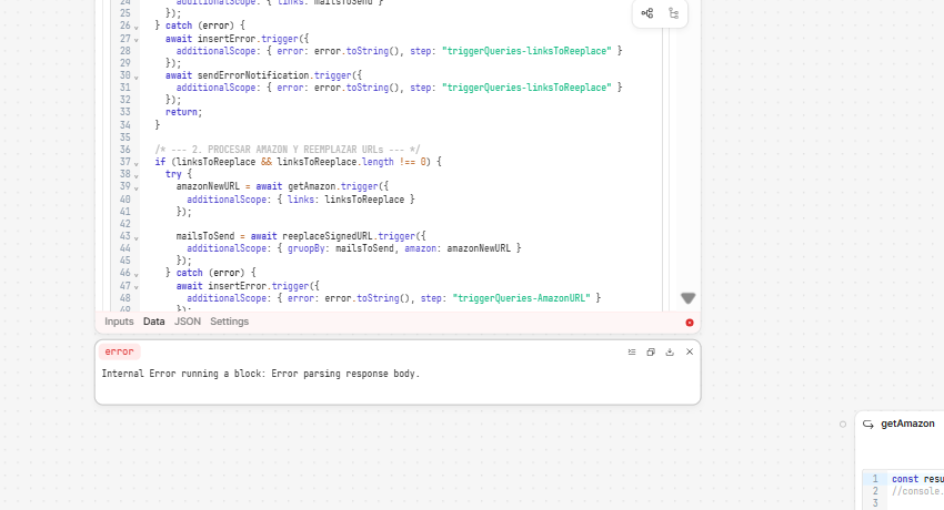 Hi Lucia, I was taking a look at this and was thinking that the issue might be due to the structure of this part of the workflow. One of the reasons I wanted to see the app export was that I was curious about the functions you were triggering and how they were set up. Now that I see the workflow, I believe using a js block to trigger unconnected blocks (getAmazon, reeplaceSignedURL, llamadaBraze, etc) is likely what is causing these errors. For example, I could imagine that the original error was from one of those blocks timing out, and these two new ones are specifically saying "internal error running a block". Despite the fact that you can trigger blocks this way, it's my impression that workflows aren't necessarily designed to run this way, and so they are breaking under the increased payload.