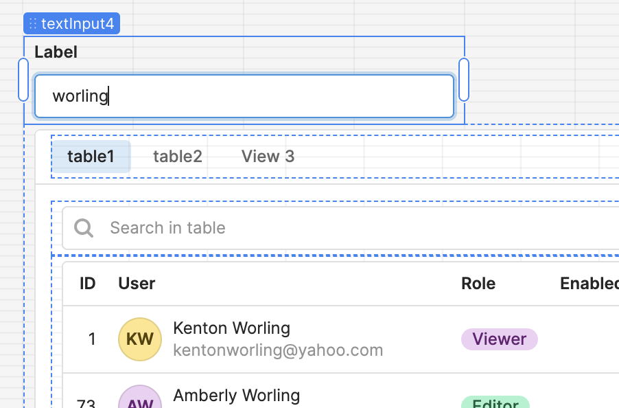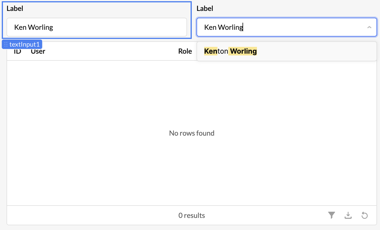 When I search for "Ken Worling" no results are found in the table. A Select component with the same data will find the person being searched for.