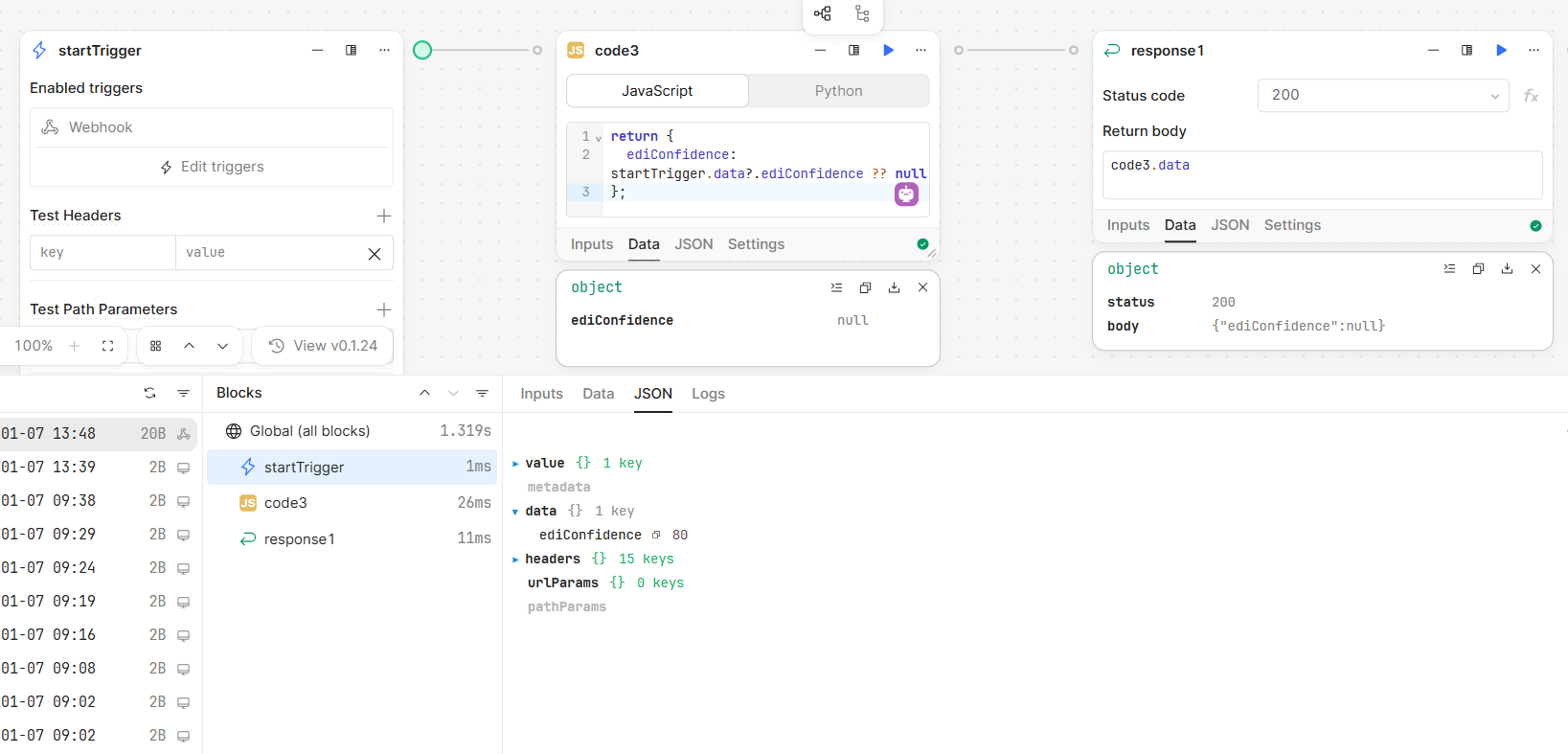 - Issue: The value appears in the logs (in retools) but I can’t get it to get in the response node to then use it correctly with a query from the app
