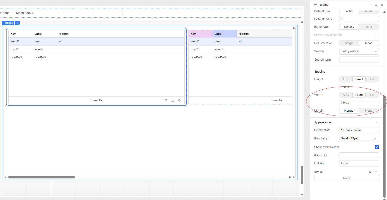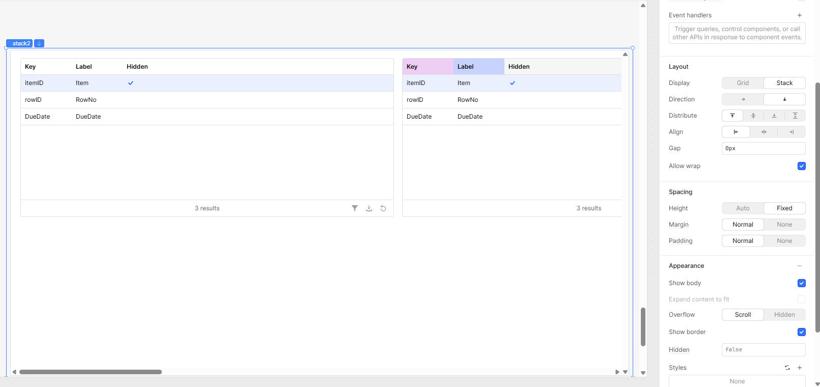 First, when adding a Stack container, set its direction to Down and assign a fixed height. Then, add your tables — for example, if you have five tables, start by adding the first one. It will automatically align side by side. After that, set the table width (e.g., 750px).