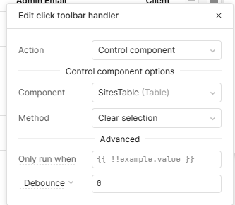 Hi @jake.albion! You can add an event handler to your toolbar button to clear the table’s selection before showing the modal.