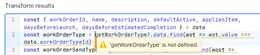 This linting warning may just be a quirk of viewing the Transformer in editor mode, were you able to test the app live, in a situation where getWorkOrderType runs and then the second query runs?