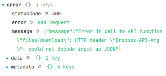 To fix the issue, always use standard double quotes in your header value like {"path":"something.xlsx"}, or use JSON.stringify [Dropbox-API-Arg: JSON.stringify({ path: "something.xlsx" }) ]to generate the header value. This will ensure your request is accepted by the API.