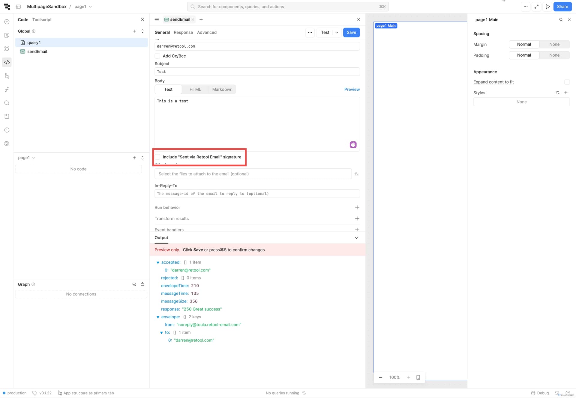 The "Sent via Retool Email" signature is likely enforced on certain plans, especially the free tier. For business-tier users, you may want to check Retoolβs settings or contact their support to see if there's an option to remove it. If no built-in setting exists, using a custom SMTP provider instead of Retool's built-in email feature might be a workaround.