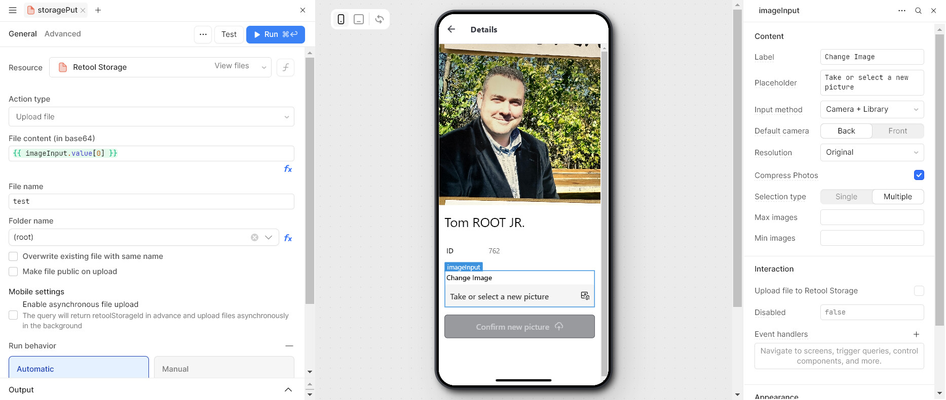 To help with this, I’ve put together a quick demo of a mobile app where you can capture an image directly from your phone’s camera, enter a custom file name through a text input, and then upload it seamlessly to Retool storage.