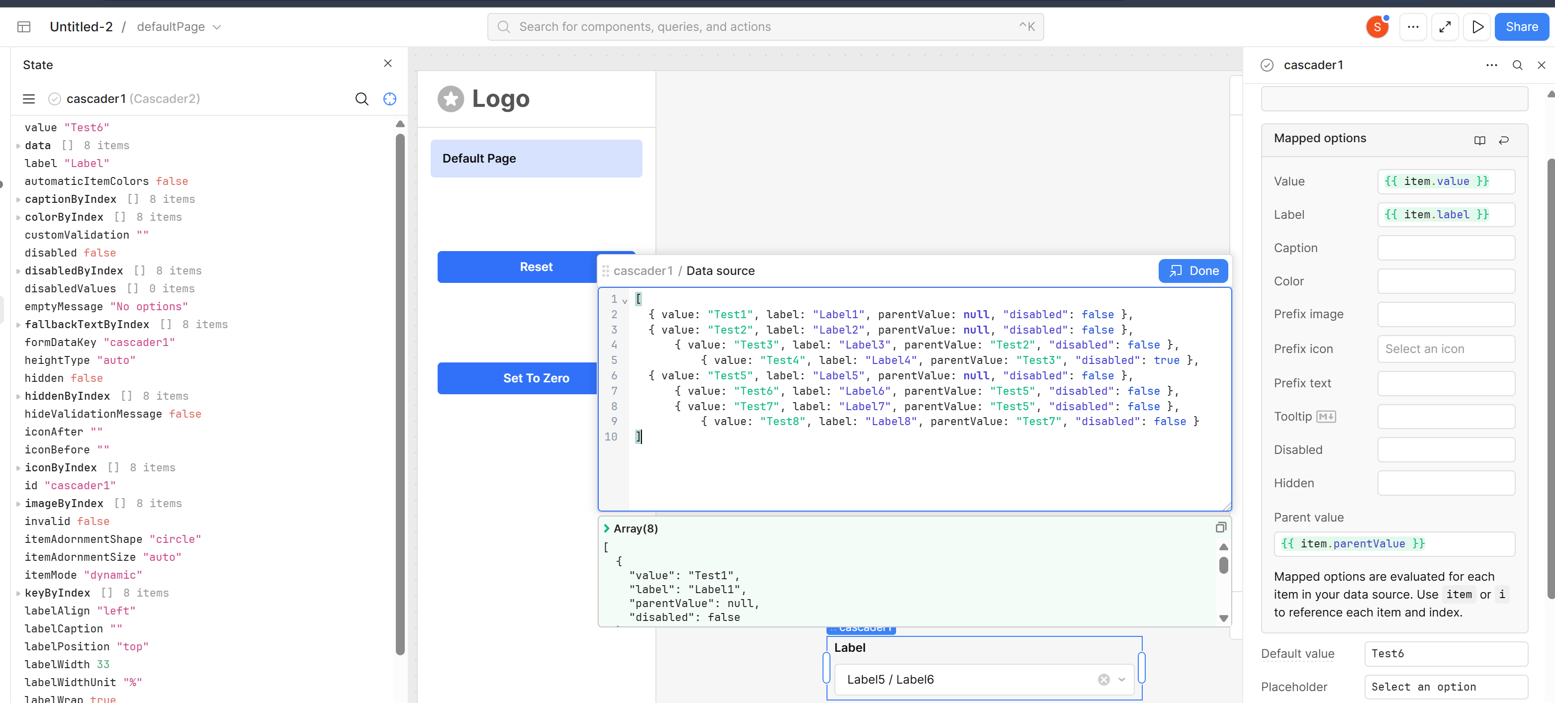 - Yes, item.value and item.label have different values. For the label, I just put "Creative Writing Tutor" and drop out the service (i.e. "Live Tutoring"), even though the value is "Live Tutoring / Creative Writing Tutor". I thought that would help with readability, but I'm happy to change the label to match that of the value if needed! I think I'm misunderstanding how the new Cascader works with parent values.