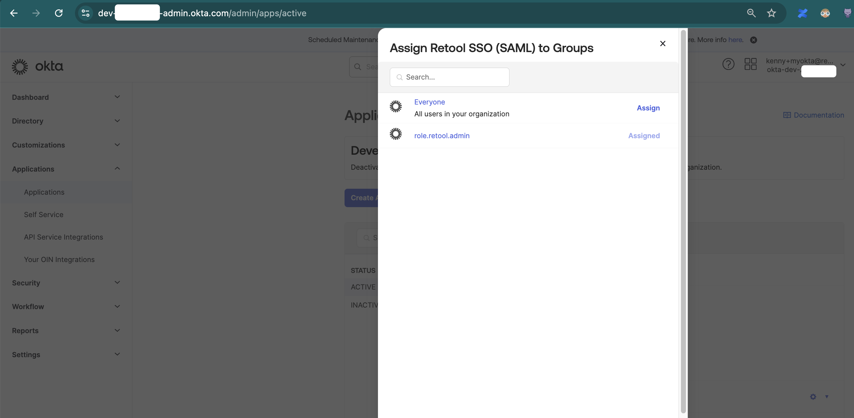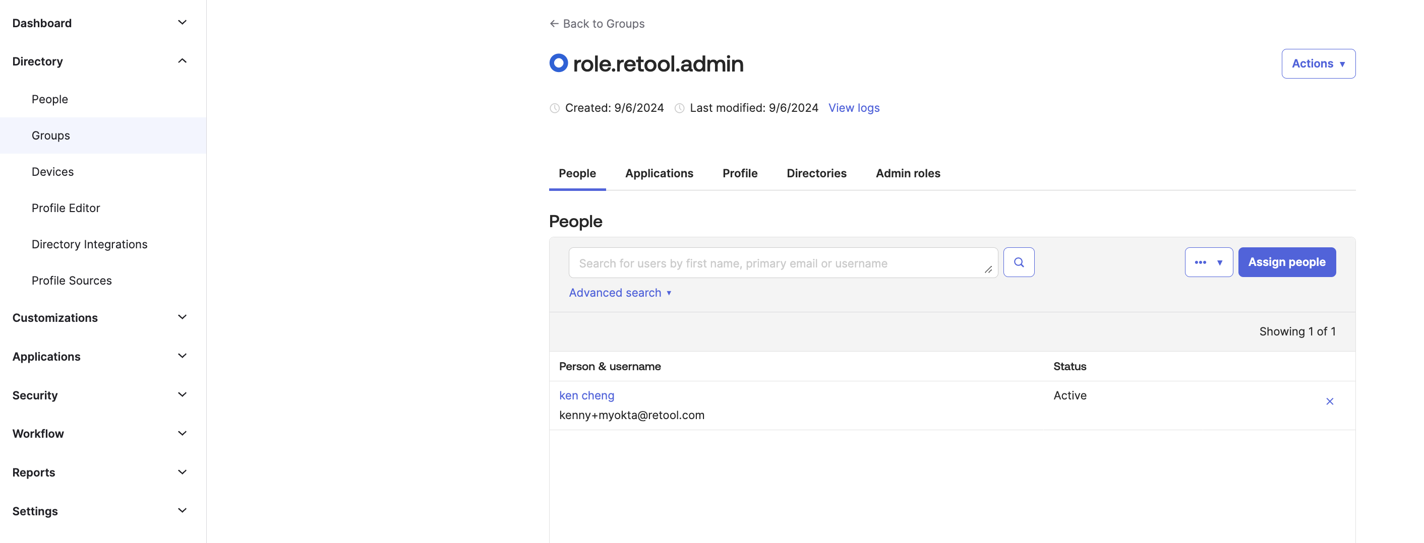 - In this example I created role.retool.admin group and assigned my user kenny+myokta@retool.com to the Group: 'role.retool.admin'