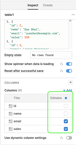 Inside your module, you can open up your right-panel and Inspect your table. If you scroll down, you should be able to see Columns. You can then click which columns are editable. You'll see in when you drag your module into your app and see that these inside your table (after double-clicking the cell), these columns will be editable. ![]()
