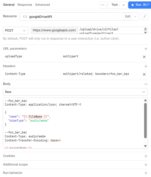 Use Google Drive’s simple upload endpoint and send the file directly.
