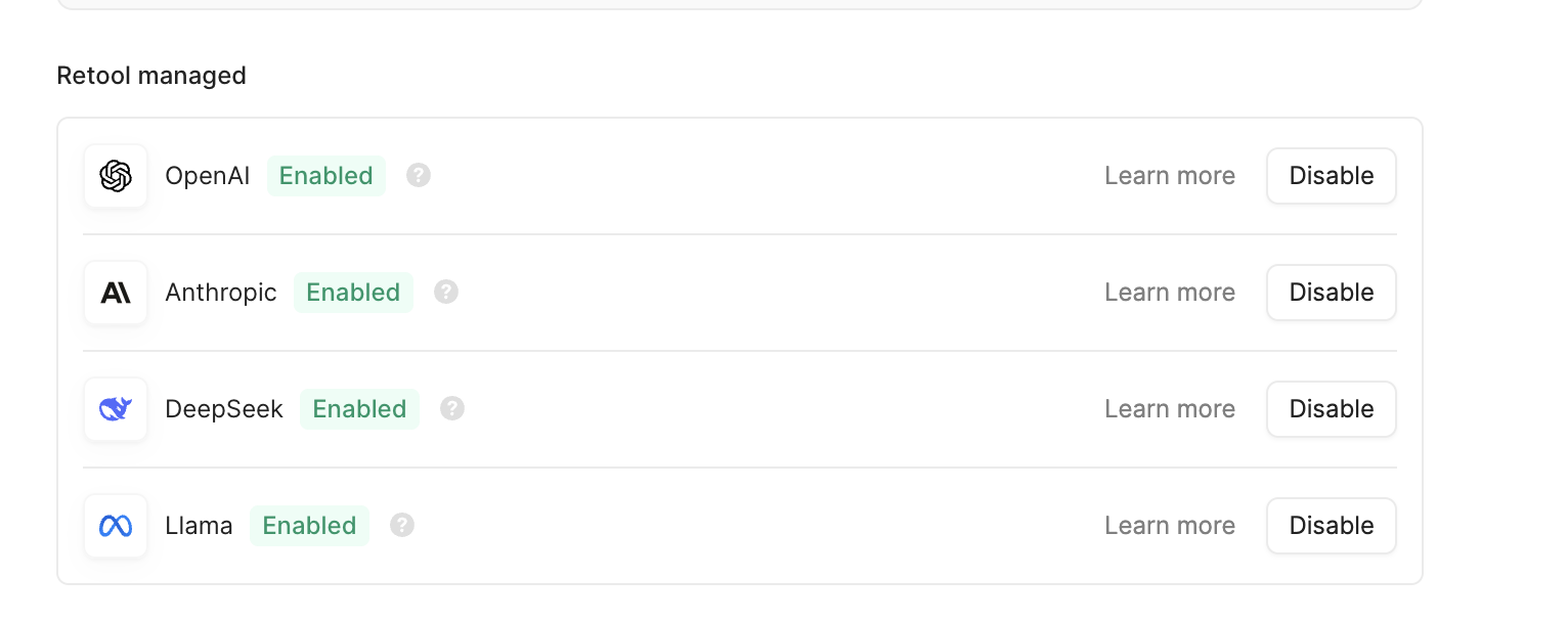 To use Retool managed resources, just navigate to resources/retool_ai and ensure that both Anthropic and OpenAI Resources are enabled under “Retool Managed”