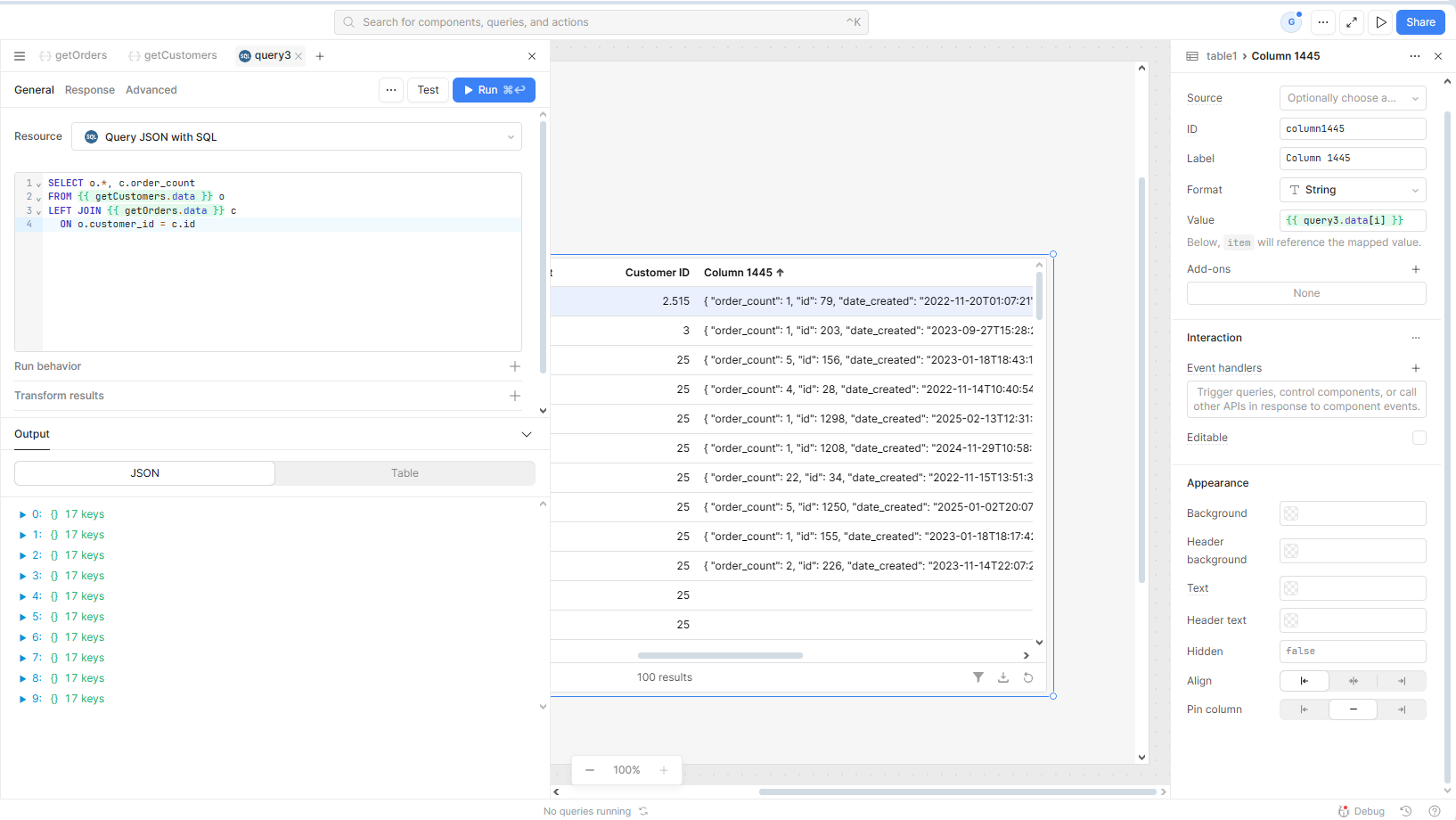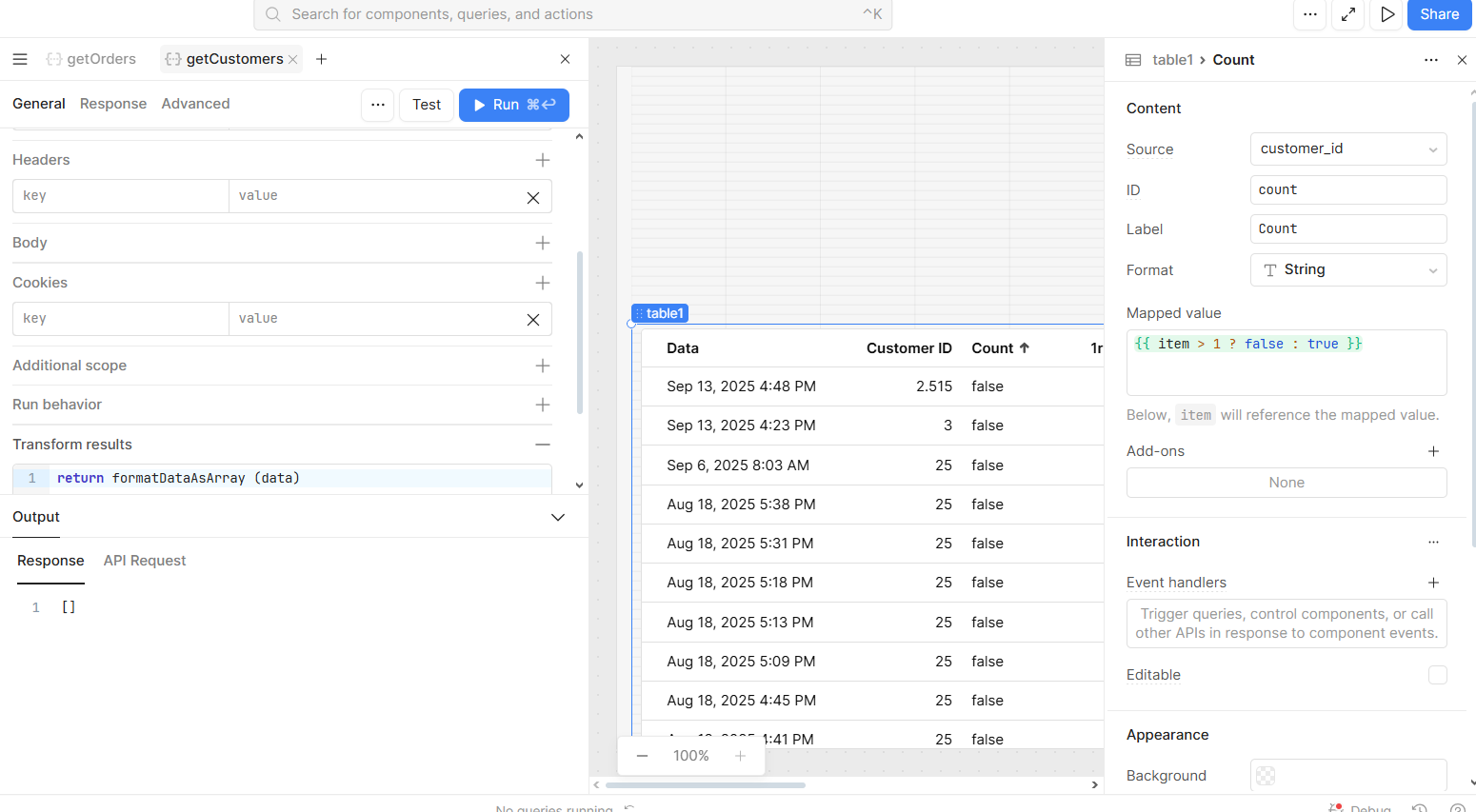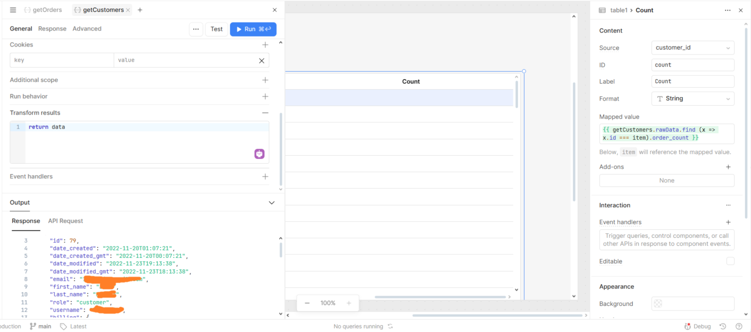 I have created a table with the information from getOrders and I would like to add a column with the information from "order_count" which is in getCustomers. I would like it to show an X if order_count = 1 and empty if it is a larger number.