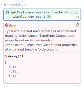 In the Mapped value you can write {{ getCustomers.rawData.find (x => x.id === item). order_count }}