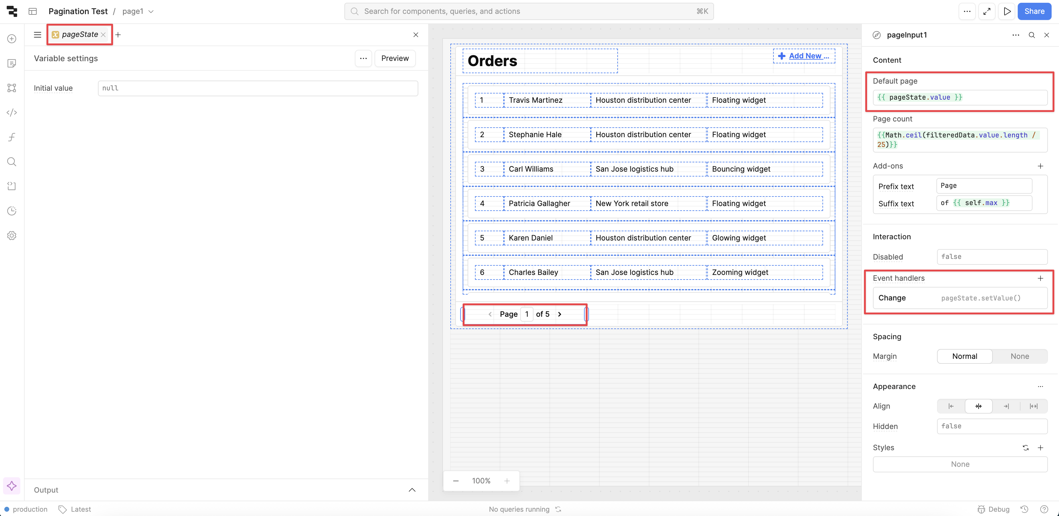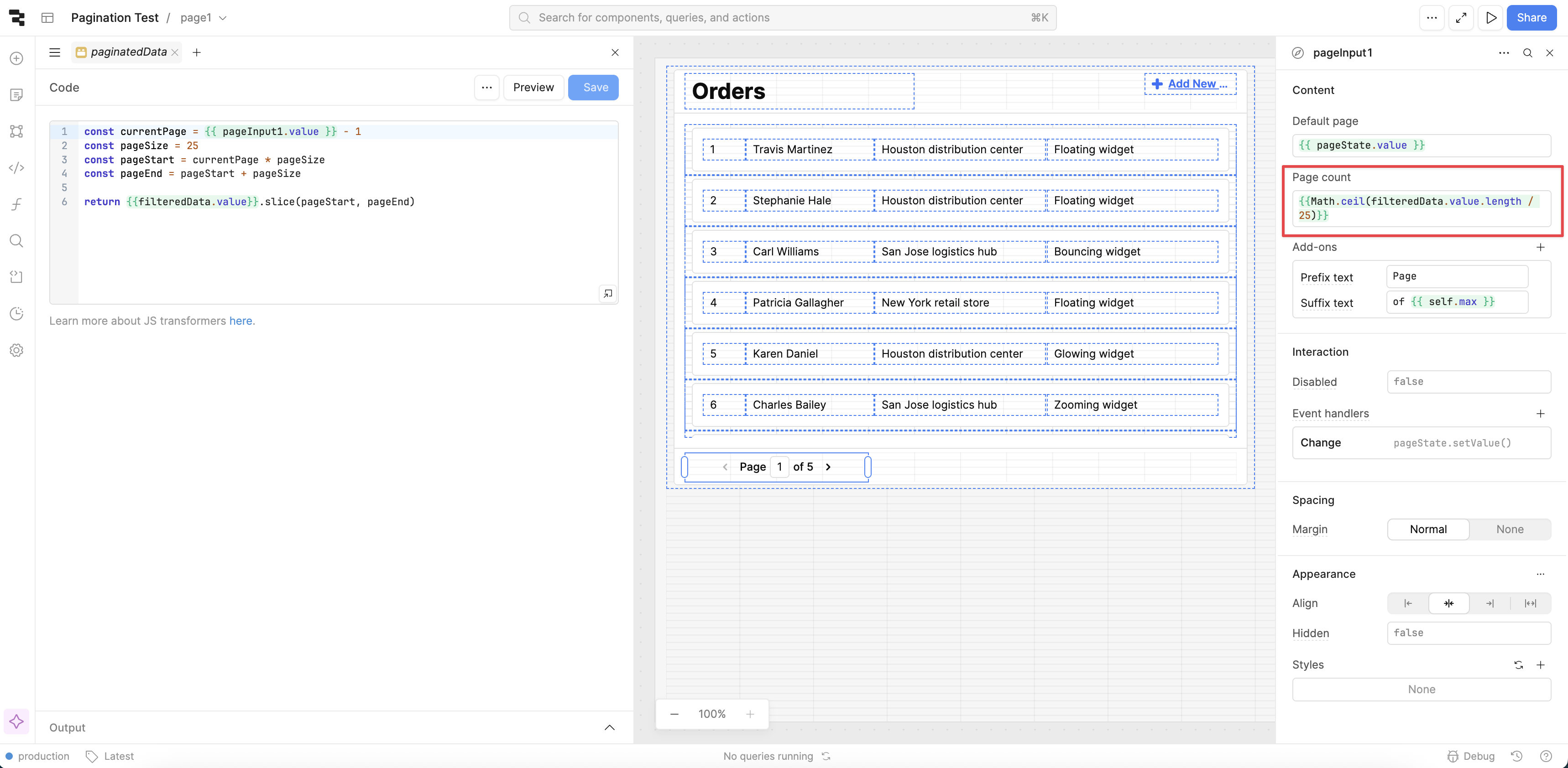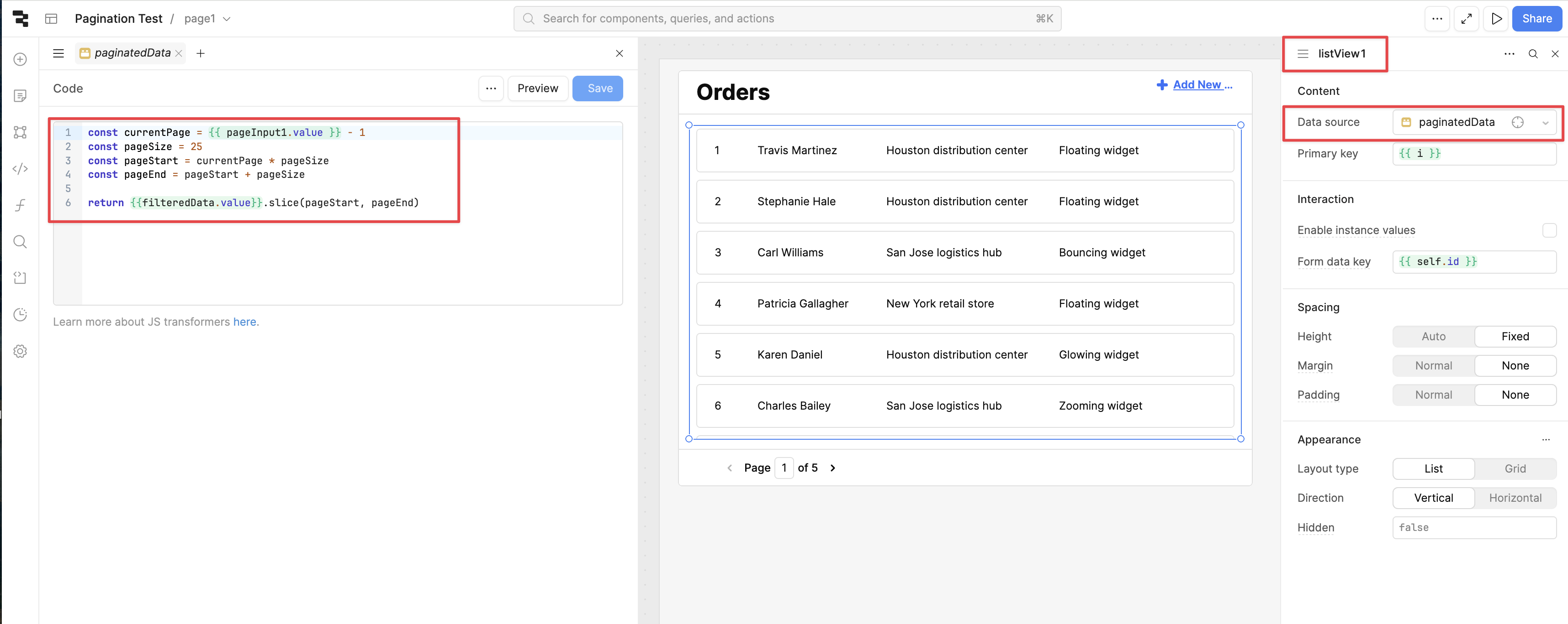 List View is the main repeatable component for apps. For datasets over 25 records, Retool recommends enabling server side pagination to improve the component's performance.